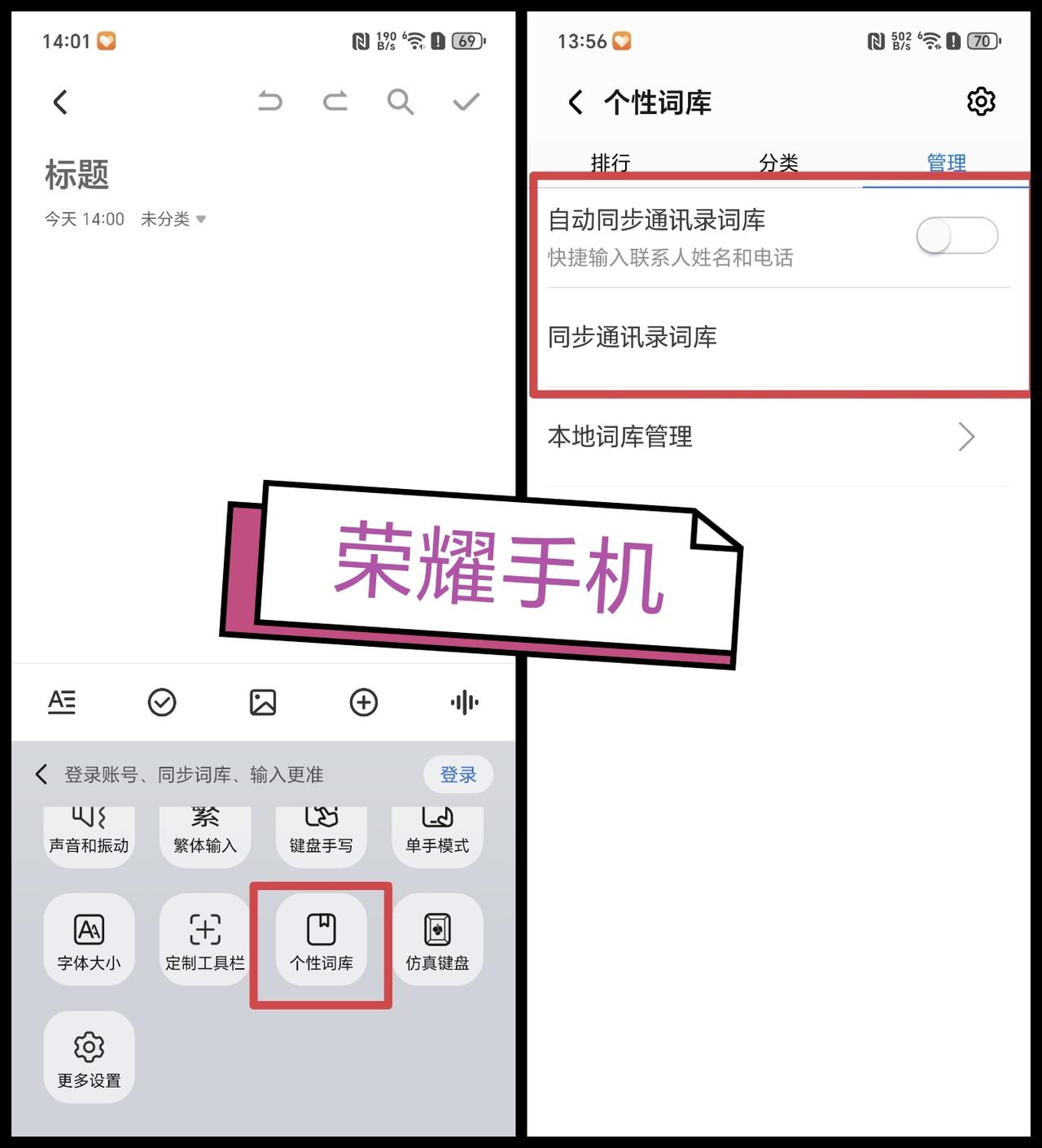 大家会让手机输入法记住个人输入习惯,还有通讯录姓名跟联系电话吗? 新机到手后,你会发现聊天时输入法会开始慢慢记忆你的个性词库,你常输入的词组,或短句,会自动联想出来。如果你输入了手机通讯录的姓名首字,还会连带出对应的号码。如果你不想泄露隐私,记得在手机输入法关闭自动同步通讯录,并清空个性词库。 以华为手机鸿蒙6.0系统为例,打开小艺输入法的“词库”,关闭“自动同步”、“自动导入通讯录词库”。然后点击“清空个人词库”、“清空通讯录词库”。 以荣耀手机magic os9.0/10.0为例,打开手机输入法,先恢复默认设置,再点击“个性词库”,关闭“自动同步通讯录词库”。 如果你需要联想如明星名字、专业术语、成语等,添加专业词库即可。这样既不影响你的输入法联想词组,也能保护个人隐私,特别是通讯录信息不外泄。 科技快讯 华为Mate80 荣耀手机