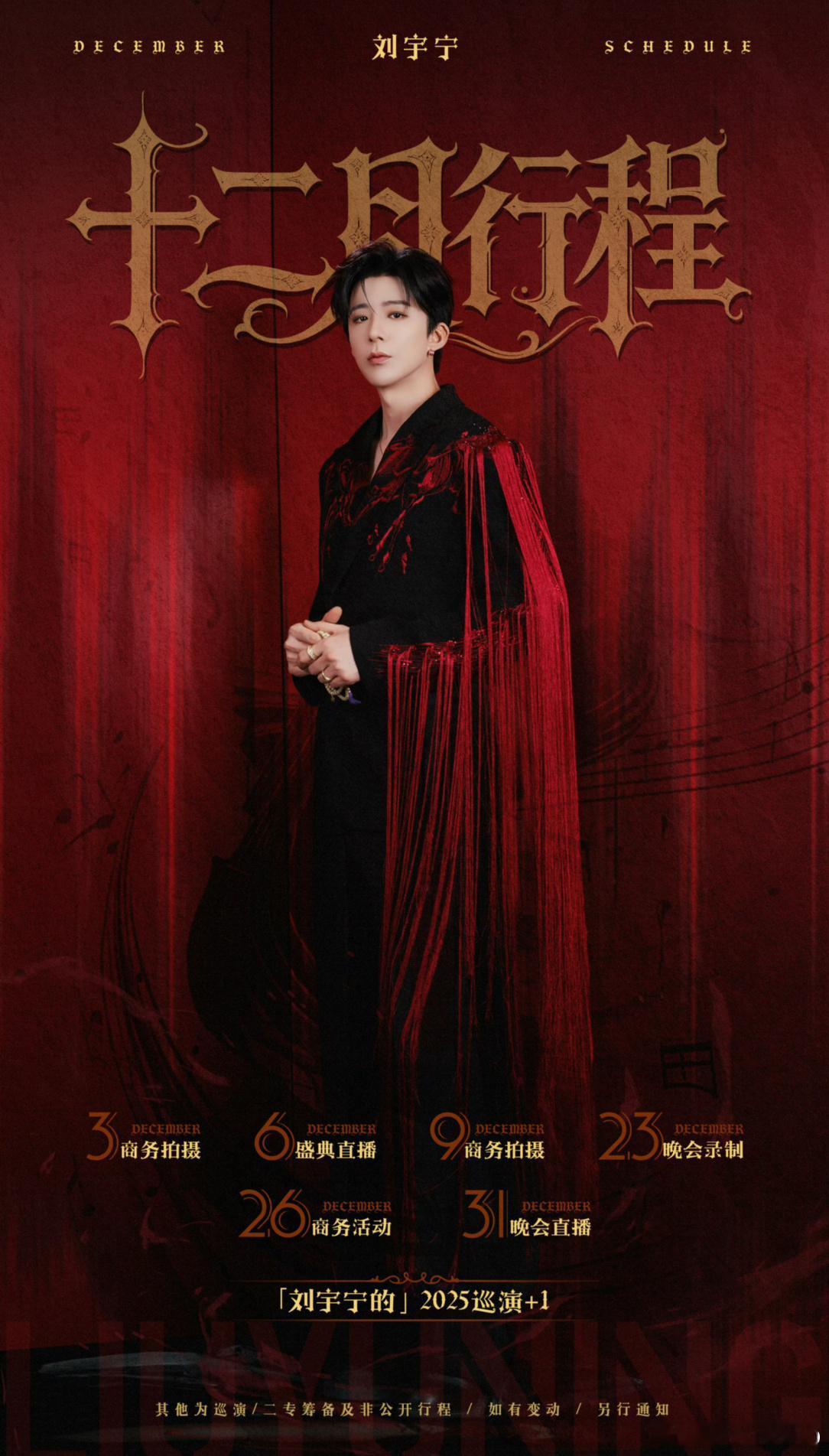 这阵容是音综人开年会吧 歌手刘宇宁 好忙呀 真是越来越好 在准备专辑12月14日:音乐缘计划2第八期播出12月17日:有歌录制12月20日:大连演唱会12月21日:星光大赏舞台12月23日:晚会录制12月31日:江苏卫视跨年晚会1月2日:音乐缘计划2年度盛典