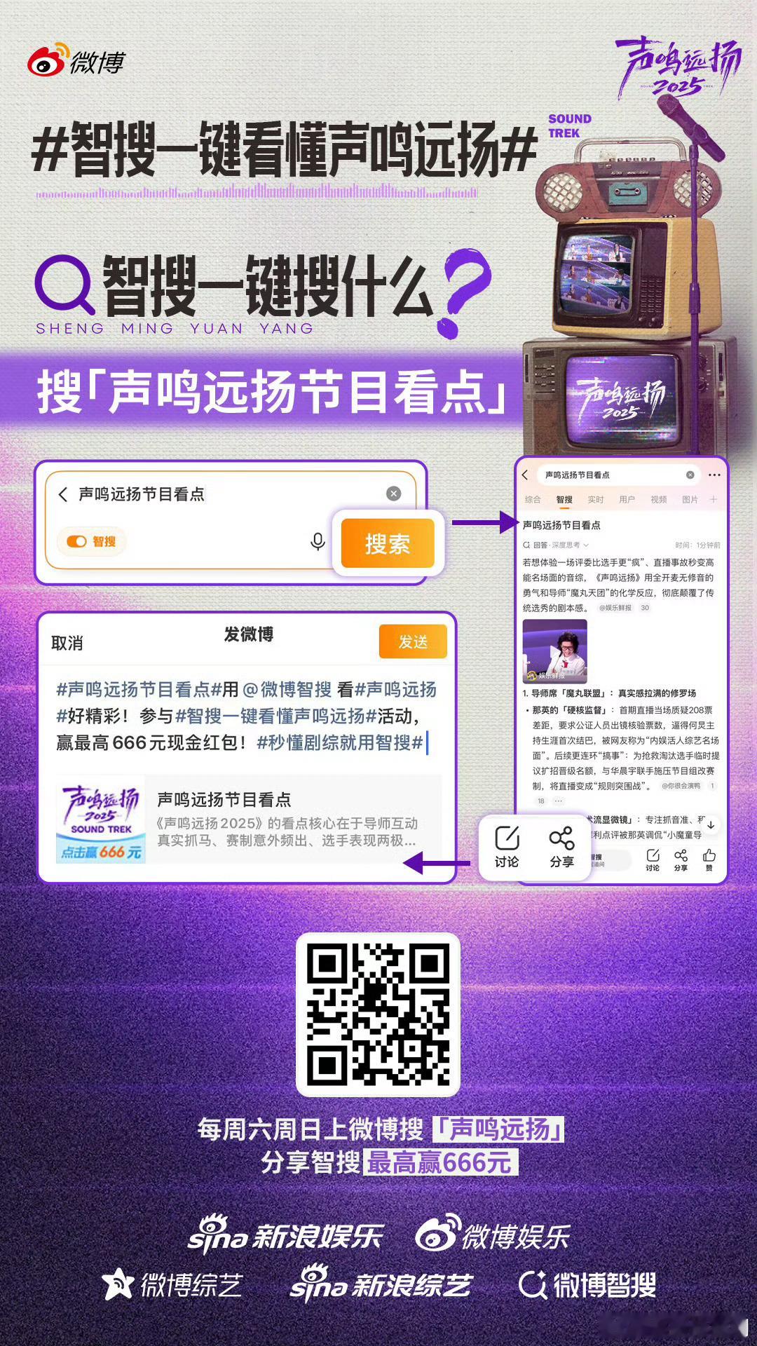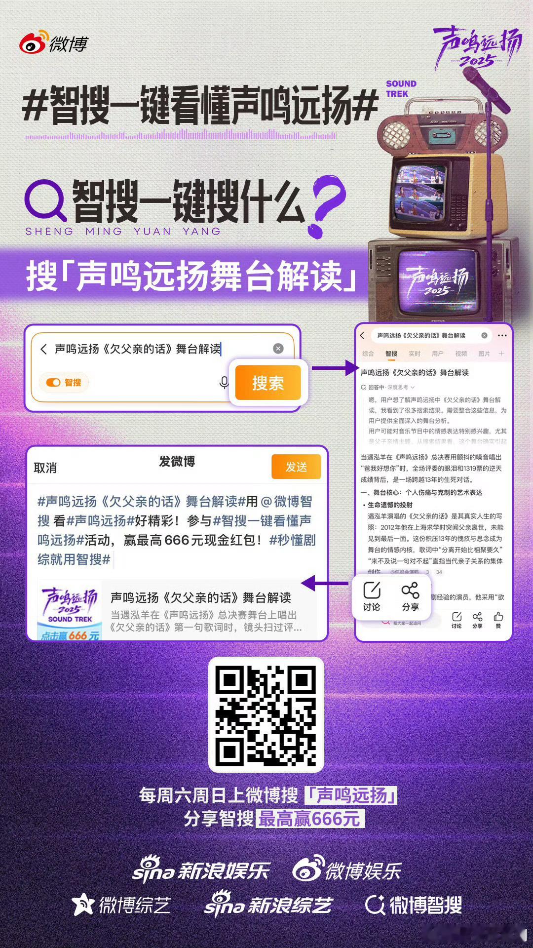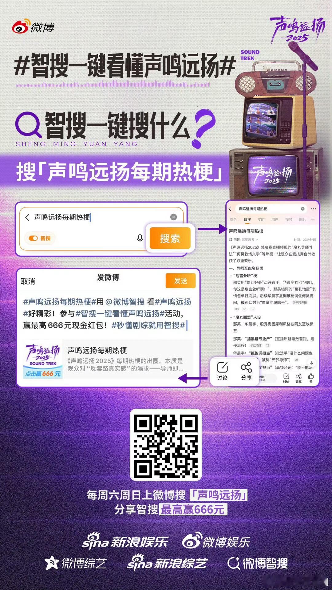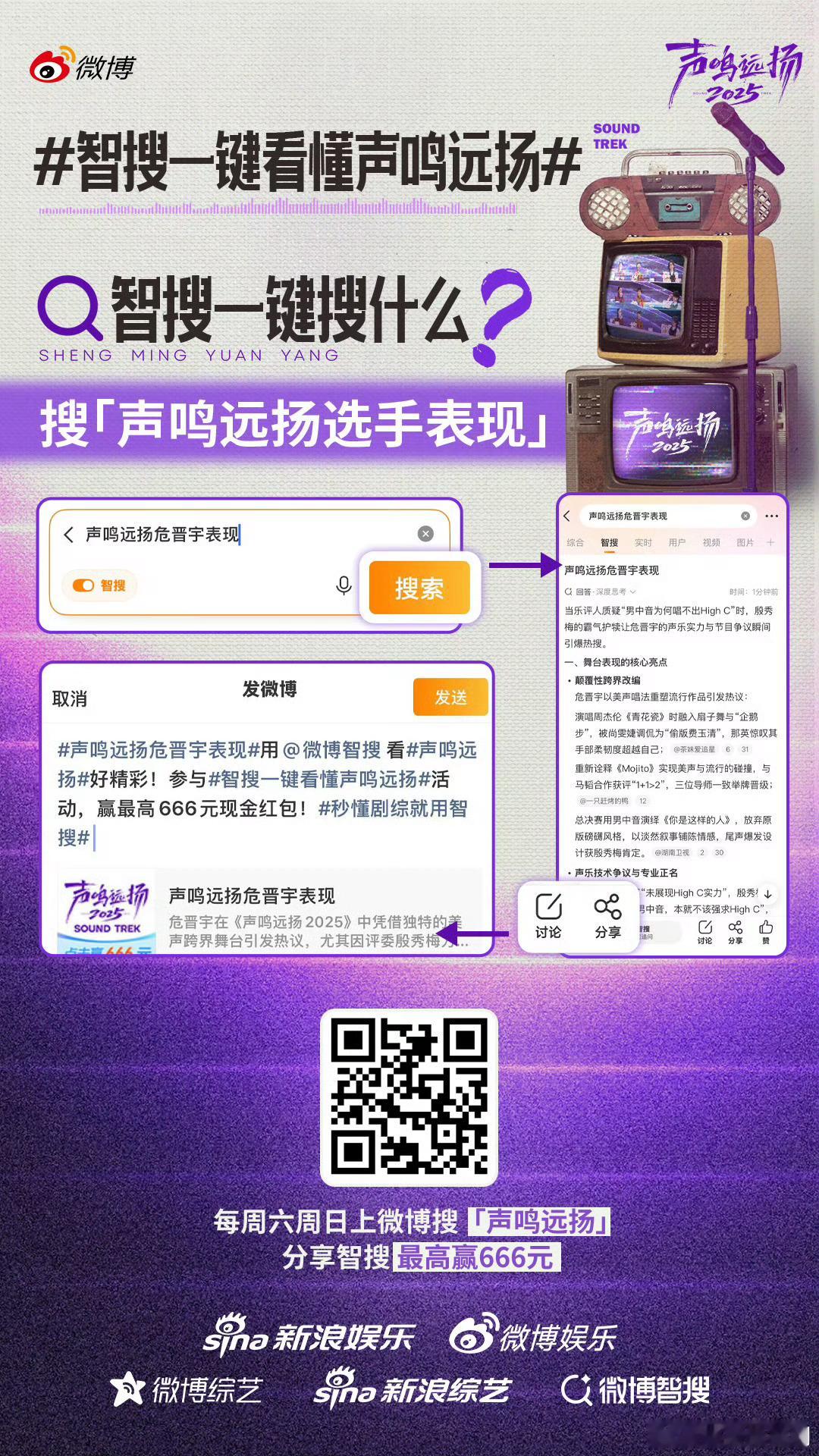 智搜一键看懂声鸣远扬哇塞!《声鸣远扬2025》居然和微博智搜搞大事了!排名、赛制、选手高光、评审名场面,连热梗辣评都一键收录,追剧再也不迷路~ 即日起至收官,每周六周日搜【声鸣远扬】点智搜,分享就有机会抽666元红包!总决赛每周日19:30 4K直播,七大平台同步播,这福利也太顶了吧~声鸣远扬