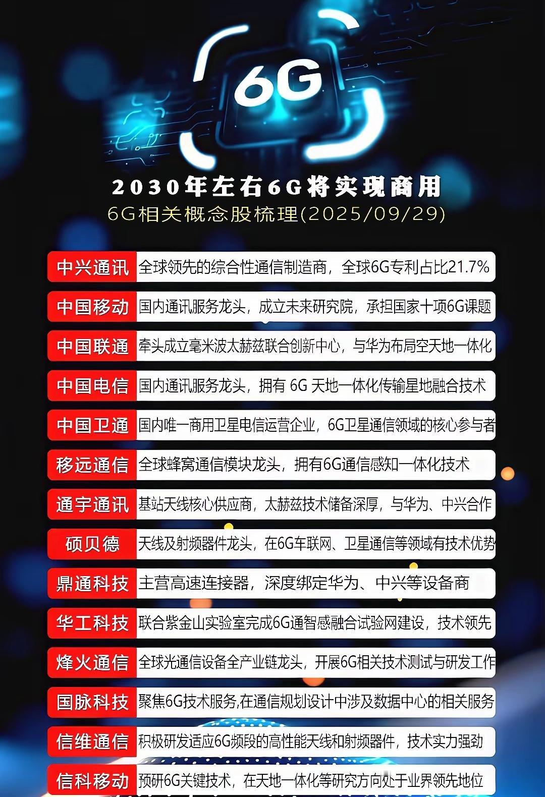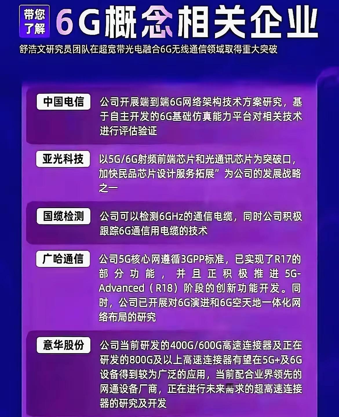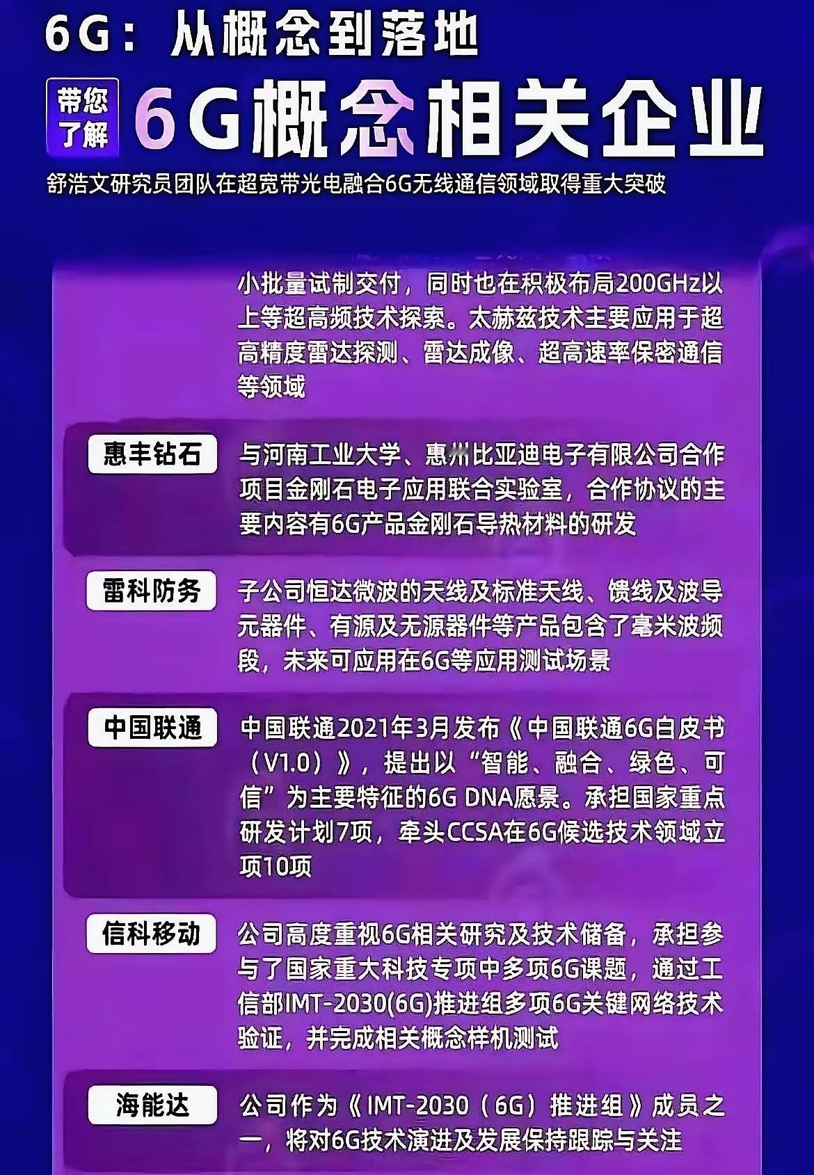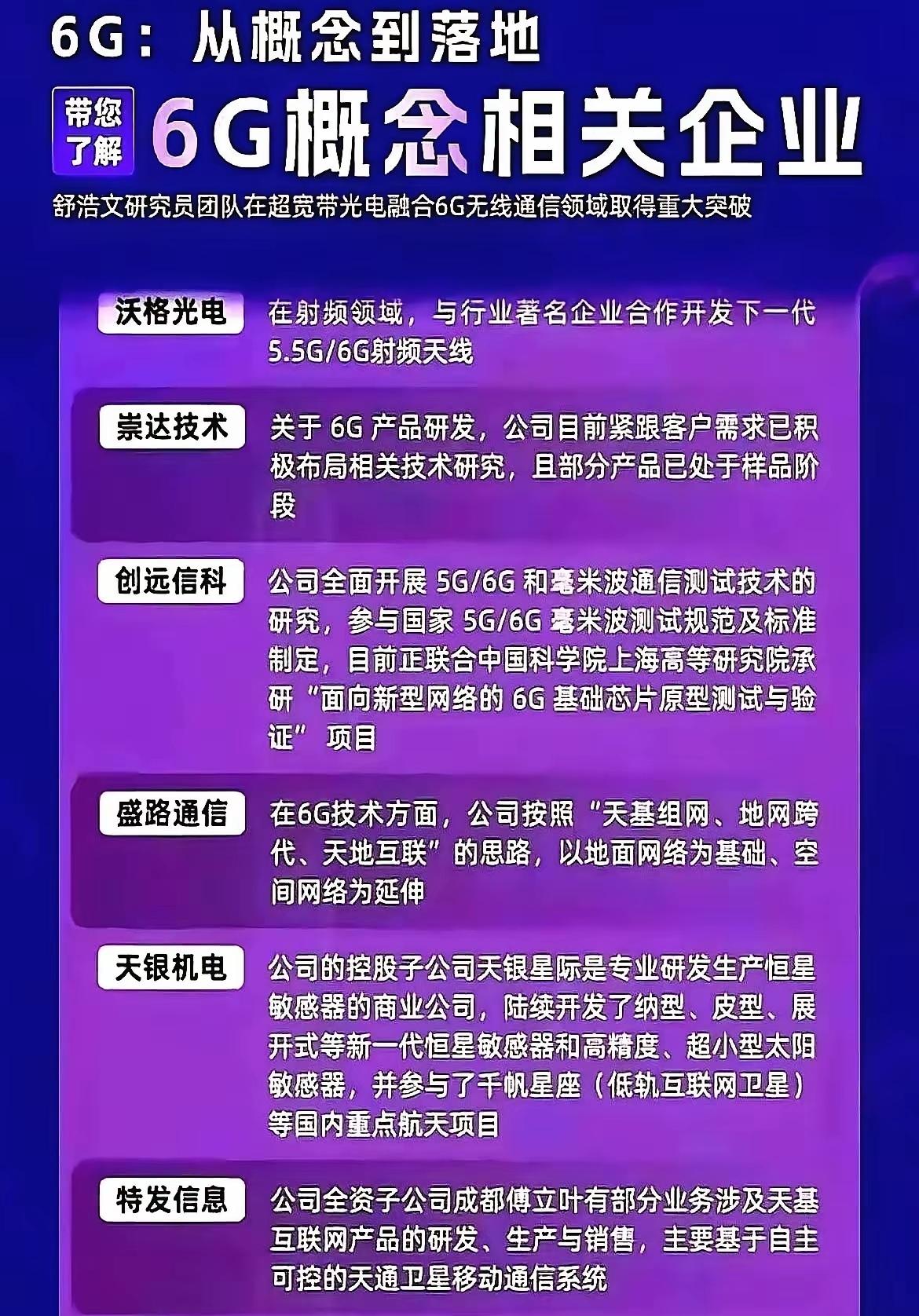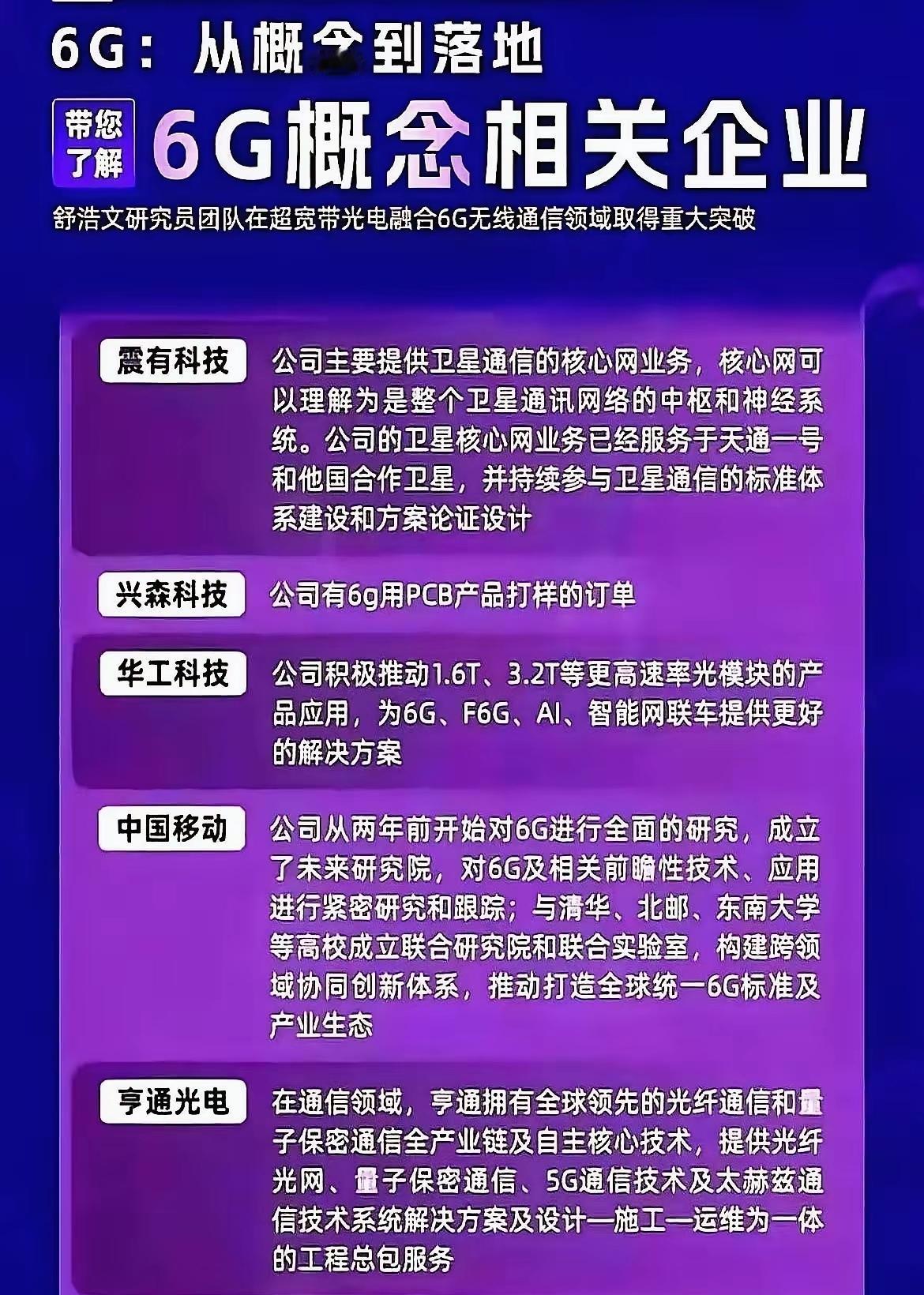 “6G:从概念到落地”,聚焦6G概念相关企业及舒浩文研究员团队的科研突破,系统介绍了多家企业在6G领域的布局与进展,具体内容如下: - 卫星通信与核心网:三维通信子公司海卫通提供卫星宽带互联网服务,解决海洋、偏远地区等场景网络覆盖;华力创通参与天通一号建设,研制高轨卫星通信基带芯片并推出移动卫星电话;震有科技提供卫星通信核心网业务,服务天通一号及国际合作卫星,参与标准体系设计;中国卫通专注卫星空间段运营及应用服务;特发信息子公司成都傅立叶涉及天基互联网产品研发,基于天通卫星系统。 - 光模块与光通信技术:华工科技推动1.6T、3.2T高速率光模块应用,服务6G、AI等领域;亨通光电拥有光纤通信和量子保密通信全产业链,提供太赫兹通信等解决方案;信科移动承担国家6G课题,完成关键网络技术验证及概念样机测试。 - PCB与射频技术:兴森科技有6G用PCB产品打样订单;沃格光电与行业企业合作开发5.5G/6G射频天线;亚光科技以5G/6G射频前端芯片和光通讯芯片为战略突破口。 - 测试与标准制定:创远信科开展5G/6G和毫米波通信测试技术研究,参与国家测试规范制定,联合中科院承研6G基础芯片原型测试项目;雷科防务子公司恒达微波的毫米波产品可用于6G测试场景。 - 网络架构与标准研究:中国移动两年前启动6G研究,成立未来研究院,联合高校构建协同创新体系;中国电信开展端到端6G网络架构研究,基于自主仿真平台评估技术;广哈通信推进5G-Advanced(R18)功能开发,研究6G空天地一体化网络;中国联通发布6G白皮书提出“智能、融合、绿色、可信”愿景,承担国家重点研发计划并牵头CCSA 6G候选技术立项。 - 连接器与前沿技术:意华股份研发的400G/600G及800G以上高速连接器有望应用于5G+及6G设备;惠丰钻石与高校、企业合作研发6G产品金刚石导热材料;天银机电子公司天银星际研发恒星敏感器,参与千帆星座等低轨卫星项目;国缆检测可检测6GHz通信电缆,跟踪6G通信用电缆技术;海能达作为IMT-2030推进组成员,跟踪6G技术演进;盛路通信按“天基组网、地网跨代、天地互联”思路布局6G技术。 整体来看,这些企业通过技术研发、产品布局、标准参与等多维度投入,共同推动6G从概念向实际应用落地,覆盖了卫星通信、光通信、射频、测试、网络架构等关键环节,展现了6G产业链的多元发展与协同创新态势。