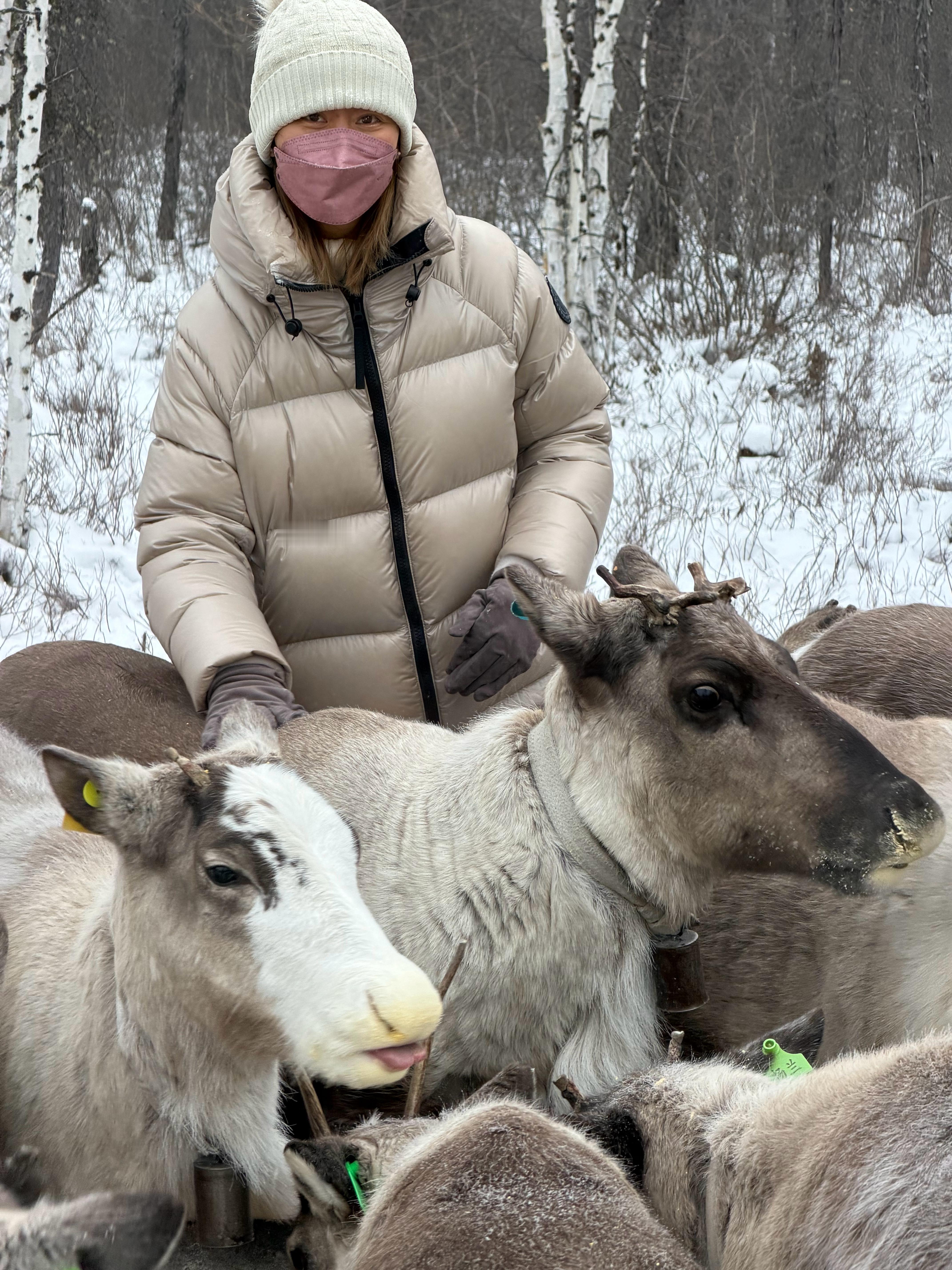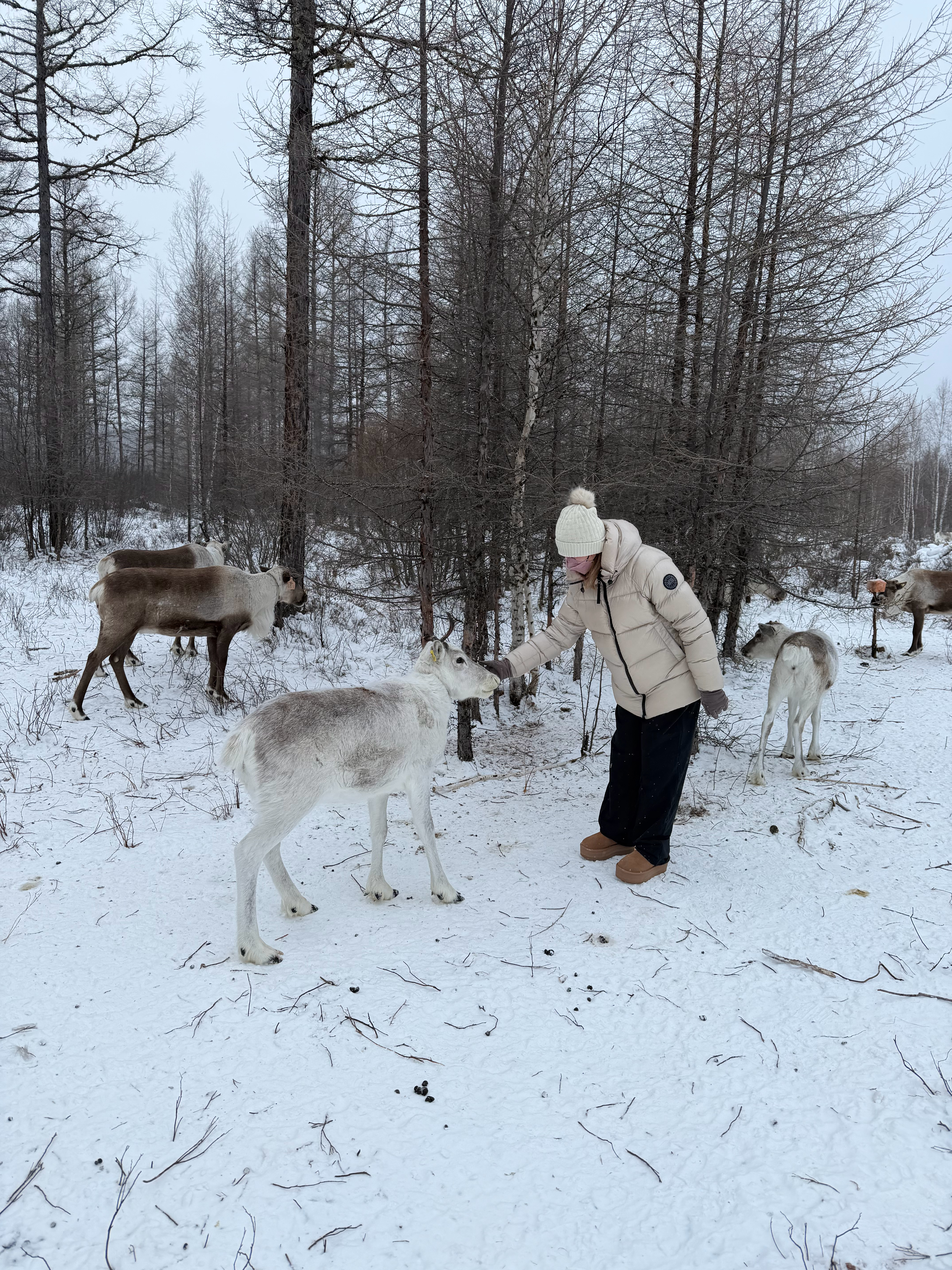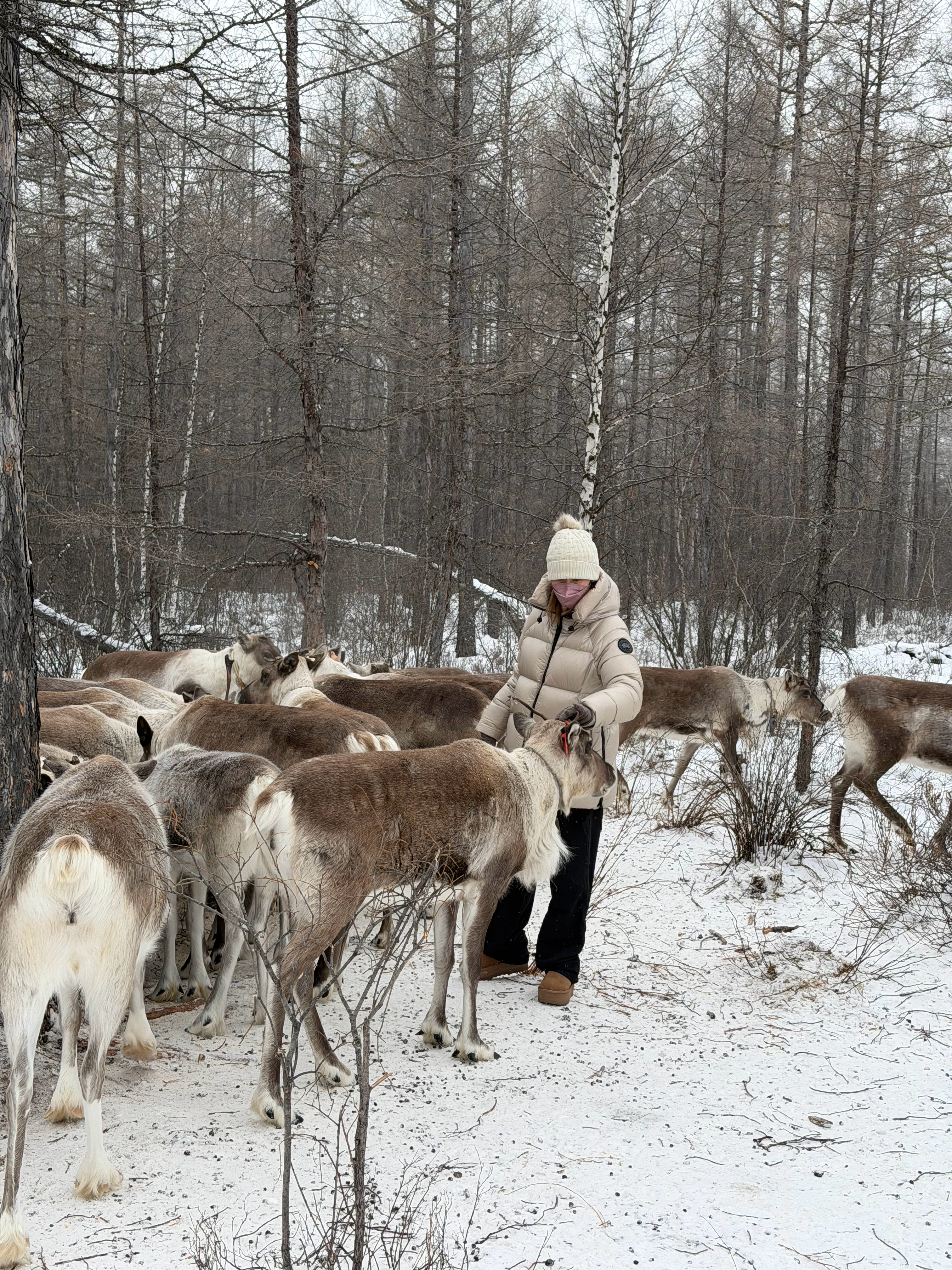 一早上被小动物包围啦,蒙古獒可爱亲人特别乖巧,运气特别好遇到了驯鹿群回家,我还被公鹿给顶了好几次