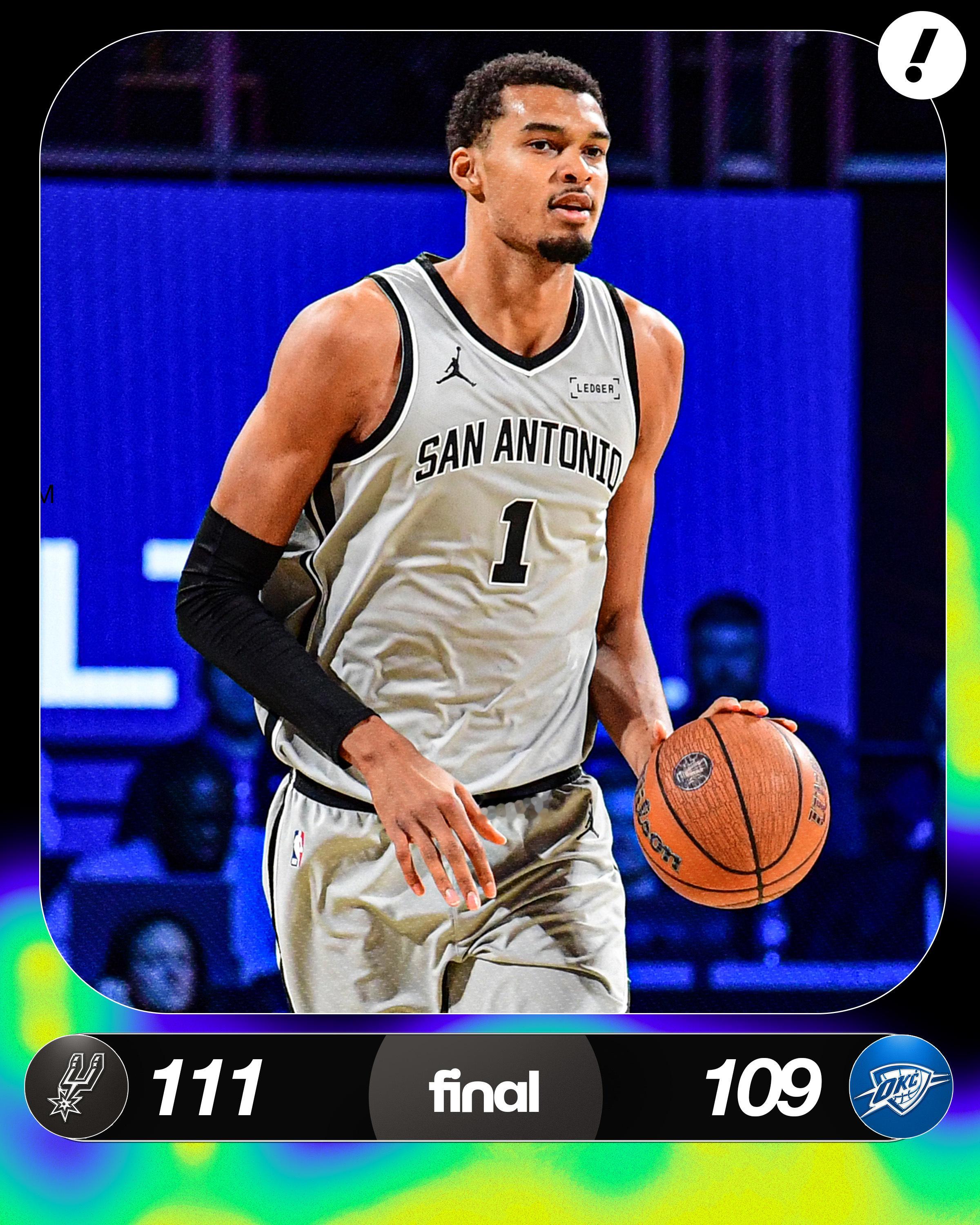 太精彩了!!马刺111-109战胜雷霆!!马刺4人得分20+,文班替补出战20分钟,拿下22分9篮板2助攻2盖帽,正负值高达+21!雷霆这赛季首发第一次合体,全队三分失准,仅37中9,亚历山大空砍29分4篮板5助攻!马刺vs雷霆马刺终结雷霆16连胜文班亚马22分