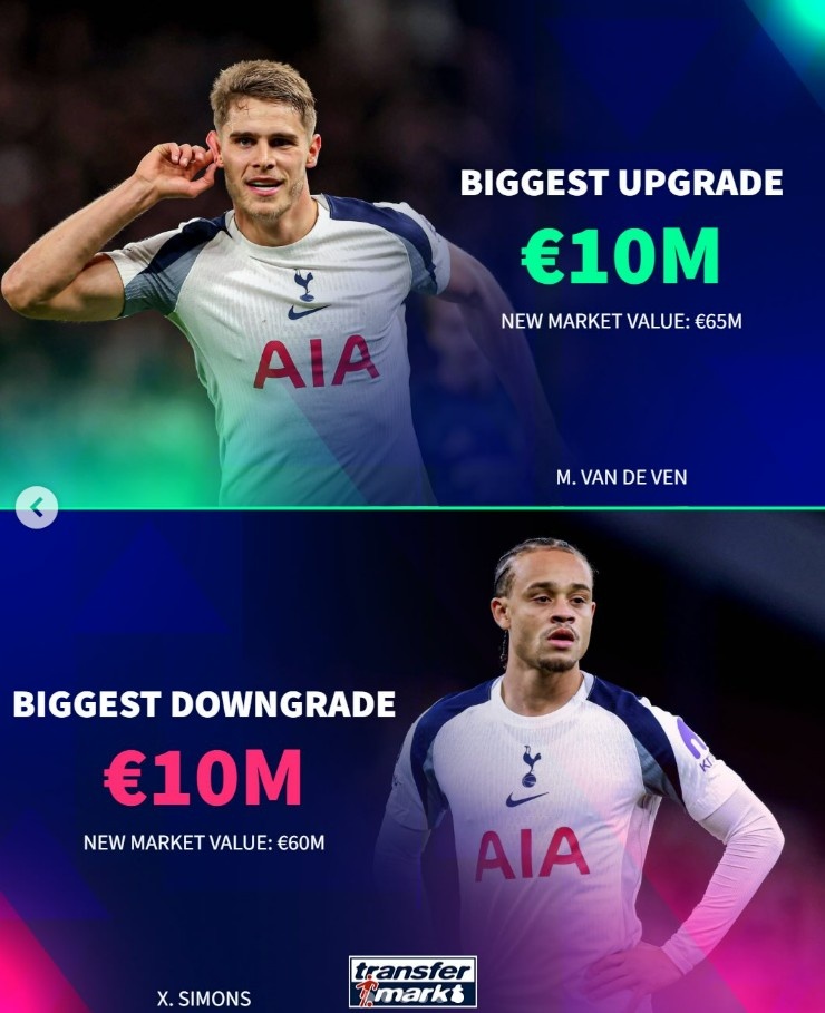 跌幅最大:哈维·西蒙斯,-1000万欧,6000万欧