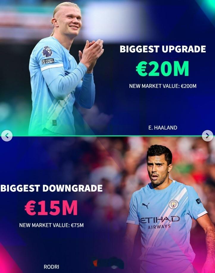涨幅最大:哈兰德,+2000万欧,2亿欧