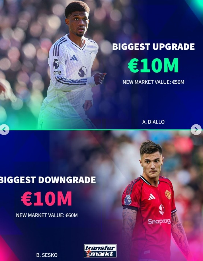 涨幅最大:阿玛德,+1000万欧,5000万欧