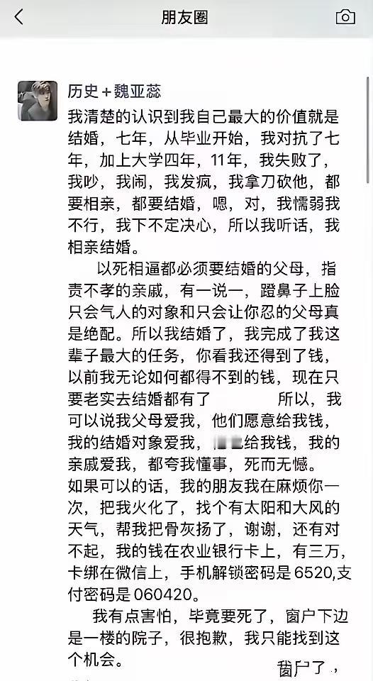 河南鲁山新娘纵身一跃,让人扼腕叹息。 一个花季女孩,用最决绝的方式,离开了深爱她的父母。 小编认为,这是原生家庭教育的悲哀。 不爱了,可以不嫁,为何要这样逼她? 从新娘的遗书上可以看出,这个女孩从上学到参加工作,最后到结婚,她的父母一直都在大包大揽,生怕女孩人生之路走错了。 女孩呢,也一直在对抗,可能女孩在内心深处,一直想逃离原生家庭的束缚吧。 父母用爱的名义,将她逼上了绝路。 这样的悲剧,父母也是没有想到的。 现在女孩的父母,也一定是最心痛的吧? 中国式父母,对于孩子结婚之事,哪怕女儿不满意,大多数也只会说忍忍就过去,老一辈子的人的婚姻就是这样,都是忍忍就过去。 可对于女孩来说,她已经忍无可忍了,这一忍,她要用一辈子的青春去祭奠。 按照常理,娘家,应该是女孩生活的底气和靠山,而不是压垮骆驼的最后一根稻草。 父母还是太专制了,以为自己的所作所为,都是为了孩子好,从来没有耐心听一听,孩子自己内心的声音。 以爱的名义,实施的控制,是亲人之间最残忍的方式。 这个女孩,一定是跟父母好话说尽了,奈何他们就是不听,现在人走了,面对白发人送黑发人的悲剧,父母的心痛无以为表。 终于女孩为自己活了一次,却是用这样决绝的方式。 愿天下父母明白一个道理,如果真的爱孩子,请尊重她,请好好说话,孩子的人生让她自己选择,她为自己的人生买单。 在这起悲剧中,可能父母一句:不行就算了,咱们再找适合的人,女孩就不会走了。 对此,大家怎么看,欢迎留言评论,谢谢大家。