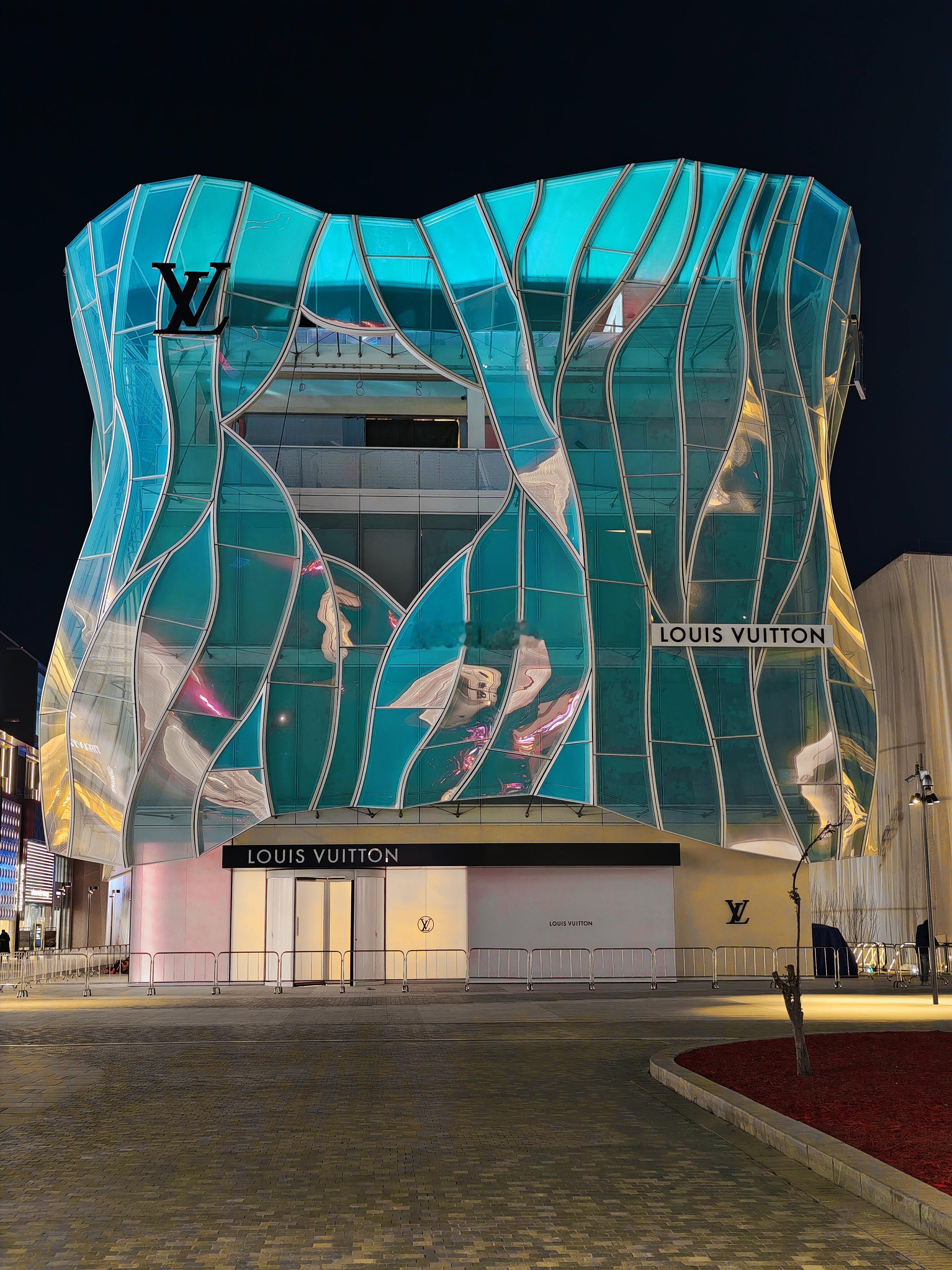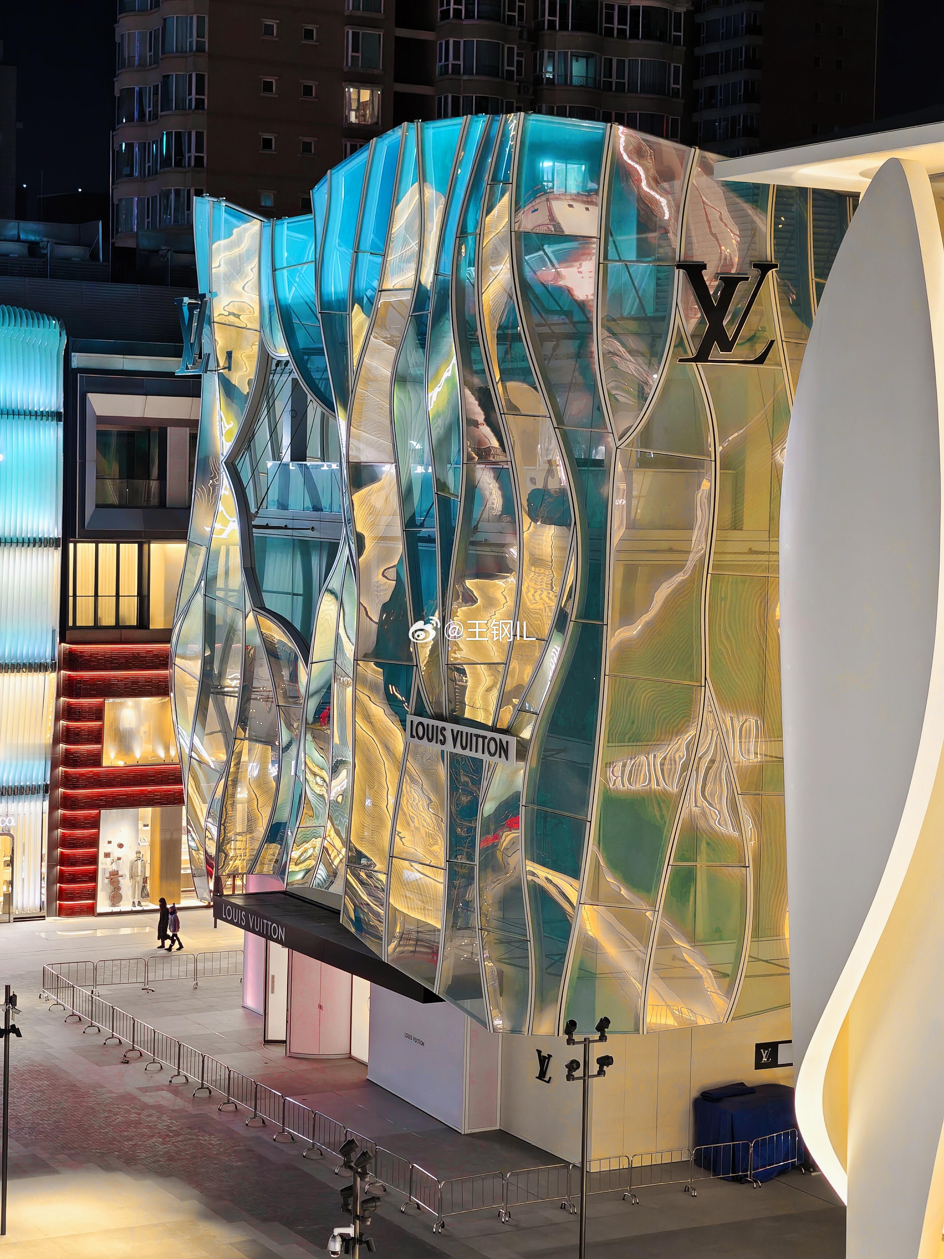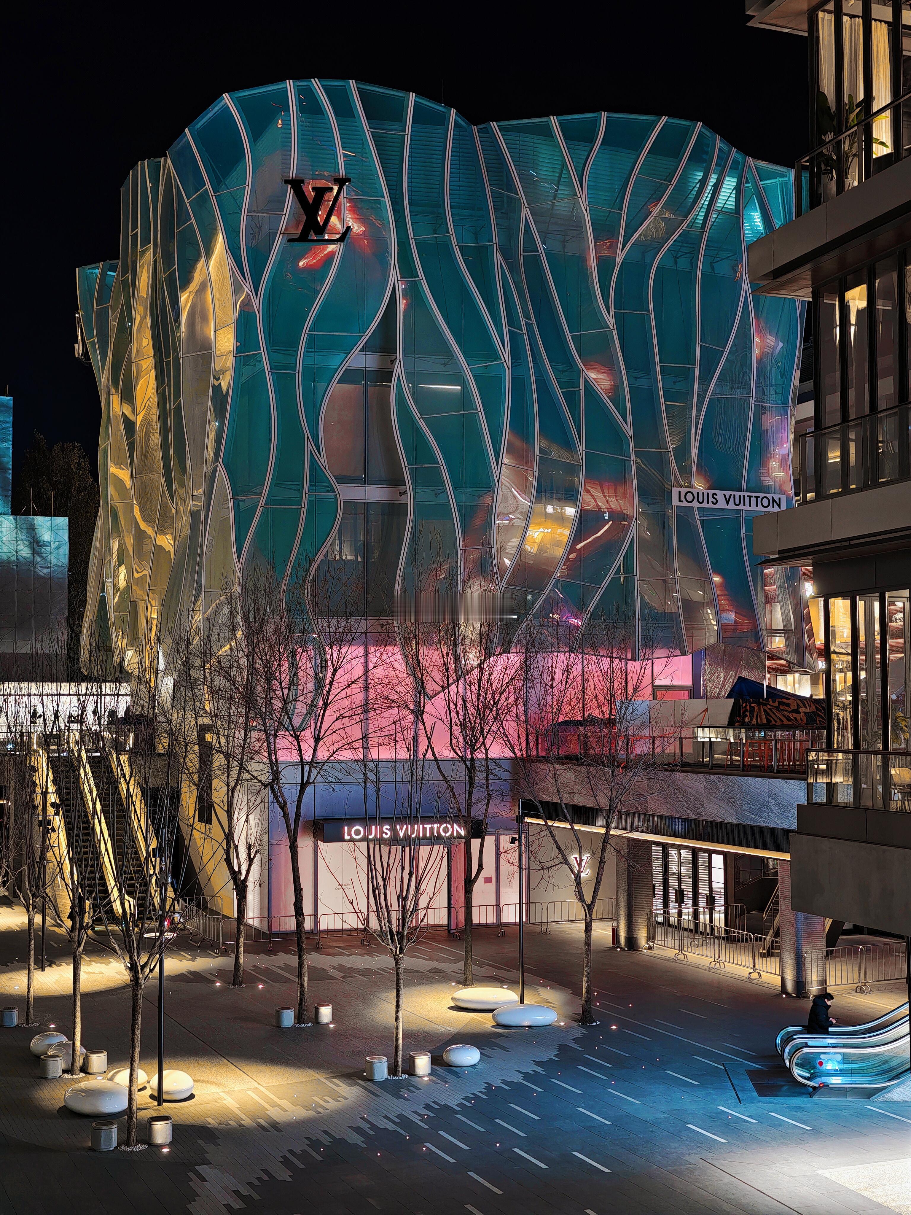 三里屯北区「演绎奢牌美学的终极表达」。五层通高落地窗既展现内部空间,又让建筑在不同光线下呈现丰富层次,兼具沉稳都市感与精致工艺感。时尚