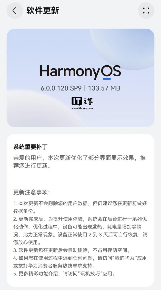 IT之家注意到,华为今日面向Mate80系列手机推送了系统重要补丁,包体大小约133.57MB,优化了部分界面显示效果。此外,Mate80系列也继续开启HarmonyOS6.0.0.120SP9版本的升级推送。