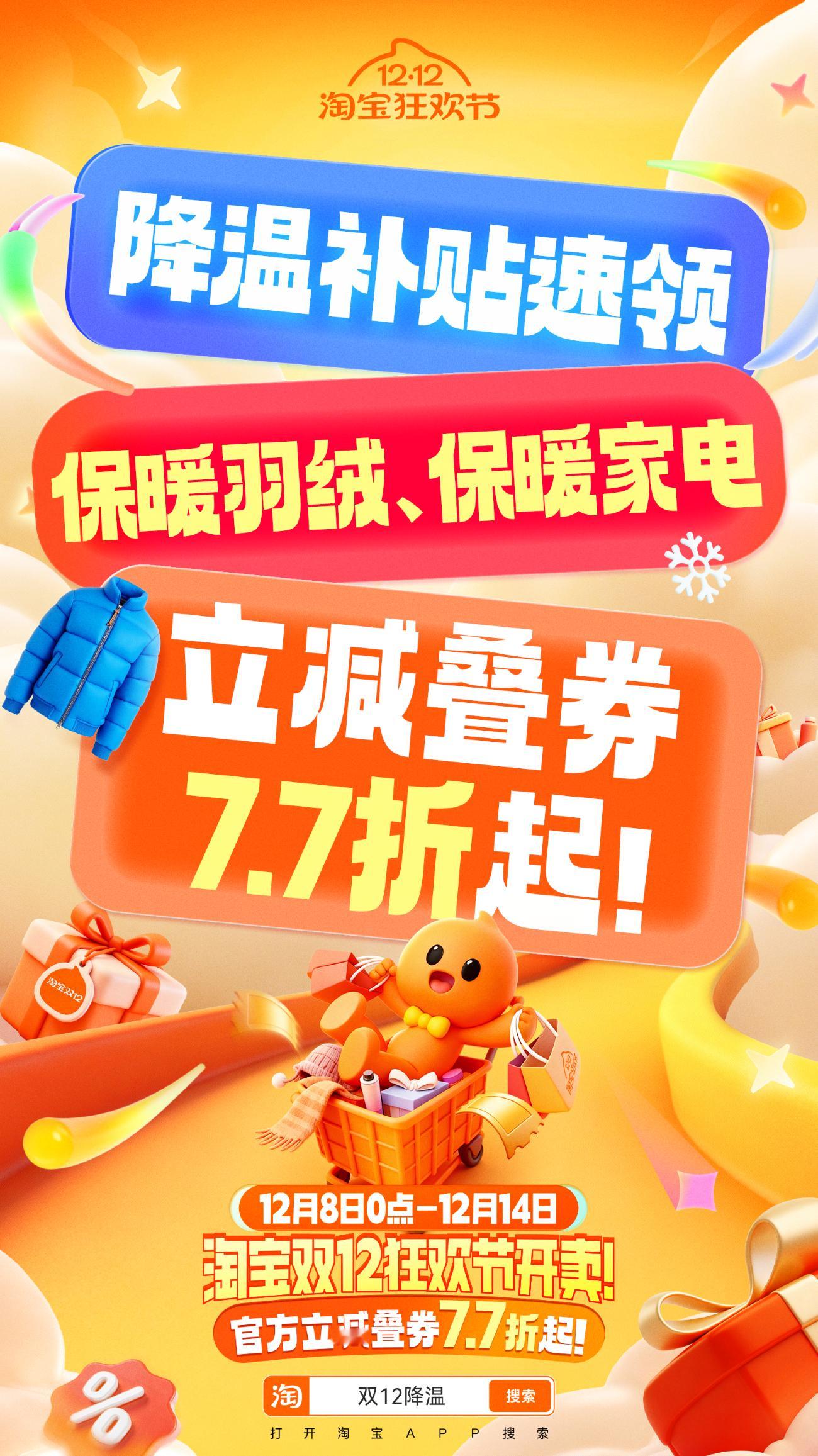 双12上淘宝扫货价带走 倒!计!时!1!天!降温补贴放送中!所有想买保暖羽绒、保暖家电速速看过来!现在上淘宝搜【双12降温】把大额券包领到手!淘宝双12狂欢热卖最后一天,官方立减商品叠券7.7折起!年末扫货价就买吧,一买一个不吱声!淘宝双12来了