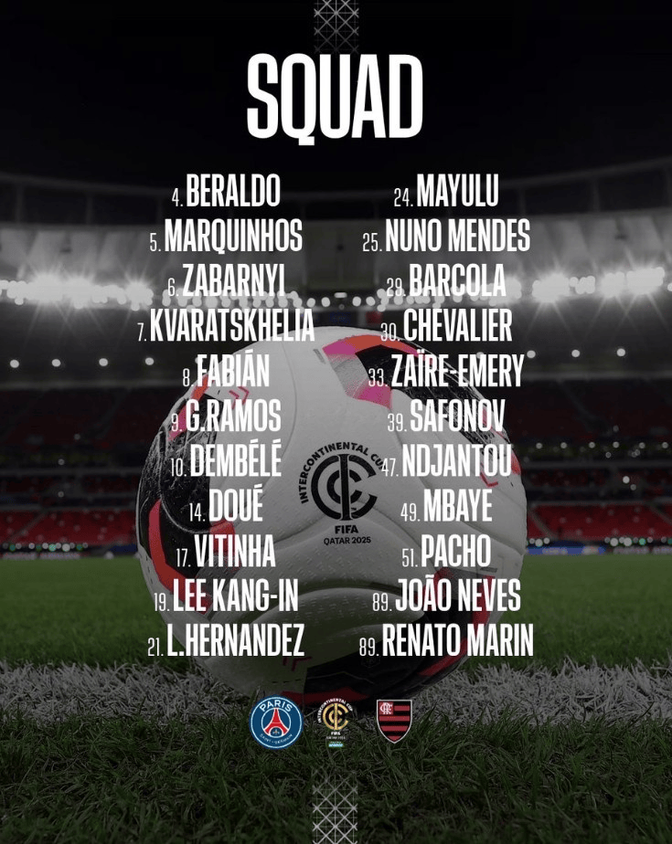 虎扑12月14日讯巴黎圣日耳曼将出战2025年FIFA洲际杯决赛,对手为巴西弗拉门戈俱乐部。巴黎俱乐部公布出征多哈的22人球员名单。