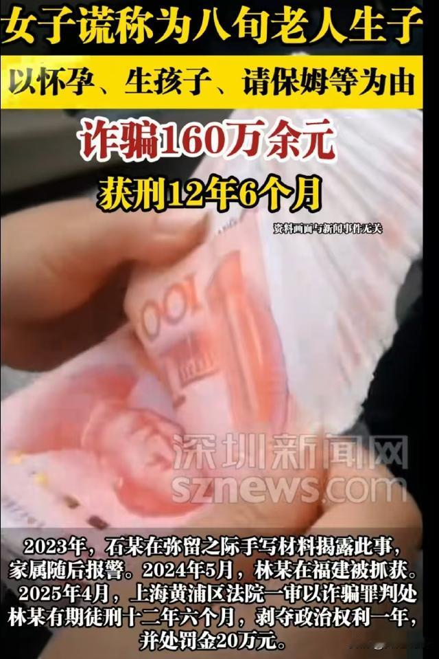 上海,35岁女子林某称自己怀了80岁老人石某的孩子,并用自己儿子假冒那个不存在的孩子,短短三年从石某手里骗走了160余万元。石某在弥留之际,手写了一份林某为自己产子的材料,家属报警。然而,林某被捕后却辩解称:我只骗了他4.5万,其余的是他自愿赠予我的! 据深圳新闻网报道,2019年,当时只有32岁的福建女子林某在上海打工。 打工期间,林某认识了当时已经70多岁的老人石某,并且,二人竟然跨越了年龄的鸿沟发展为男女关系。 第二年林某离开上海回到老家福建,并且在老家火速结婚。 因手头不宽裕,林某又想起了上海有钱老头石某,于是她将自己怀孕的化验单发给了石某,称她怀的是石某的孩子。 石某听说自己老来得子顿时高兴坏了,林某找他要钱产检,石某就大方给钱。 从此以后,林某经常以怀孕、请保姆、生孩子等理由找石某要钱。 石某想着林某怀的是自己的孩子,便一次又一次大方给钱。 就这样,林某一发不可收拾,从2020年8月开始,一直到2023年,她哄着石某,说她给石某生了一个儿子牛牛,并以虚构的牛牛为借口,找各种理由找石某要钱,短短三年,石某就给她转了160余万。 后来,石某的身体状况急转直下,在弥留之际,石某不知道是惦念自己那个老来得子的儿子牛牛,还是幡然醒悟了,竟然手写了一份材料,将林某和自己的关系,以及林某给他生了个儿子一事,全部说了出来。 石某的家属看到后认为,石某已经80多岁了不可能突然冒出来个儿子,他肯定是被骗了。 家属报了警,2025年5月8日,林某被抓捕归案。 被捕后,林某对自己编造孩子诈骗石某的事供认不讳,可等到庭审时,林某又翻供了,称自己确实怀过石某的孩子,只不过后来流掉了。 后来,林某又说石某知道孩子不是他的,一直给自己转钱,是因为两人是情人关系,两人经常 裸 聊。 林某前后供词不一致,且与民警调查结果不相符。而据调查,林某多次在聊天中提及她为石某养儿子辛苦,并以此向石某索要钱财。 显然,林某的行为构成了诈骗罪。 依据《刑法》第二百六十六条规定,诈骗罪是指以非法占有为目的,用虚构事实或者隐瞒真相的方法,骗取数额较大的公私财物的行为。 林某在与石某发展为情人关系后,回老家结婚,因手头不宽裕,蓄意编造怀了石某的孩子及生子的事实向石某要钱。 从动机来看,林某知晓石某有经济能力,利用石某老来得子的心理,以怀孕产检、请保姆、孩子成长等为由反复索要钱财,其目的是将石某的财物据为己有,符合诈骗罪主观故意的构成要件。 林某先是将自己怀孕的化验单发给石某,谎称怀了石某的孩子;之后又假称自己和丈夫所生的儿子是石某的,长期以虚构的儿子牛牛为借口找石某要钱。 石某基于林某编造的孩子存在的事实,陷入错误认识,一次又一次地给林某转账,共计转了160余万元。 庭审时,林某虽然翻供,称确实怀过石某孩子后流产,还称石某知道孩子不是他的,转钱是因为情人关系。 但是,林某的这些辩解在证据面前均不成立。 民警调查发现,林某多次在聊天中提及为石某养儿子辛苦并以此索要钱财,足以证明林某虚构孩子事实进行诈骗的行为。 而林某前后不一致的供词与民警调查结果严重不符,不能作为其无罪或罪轻的依据。 法律认定案件事实主要依据证据,林某无法提供证据支持自己的辩解,所以只能依据现有证据来认定其犯罪行为。 根据相关法律及司法解释,诈骗公私财物价值五十万元以上的,应当认定为“数额特别巨大”。 林某骗取石某160余万元,数额特别巨大。虽然她极力狡辩,可一审二审均判她构成诈骗罪,最终,林某获刑12年6个月,并处罚金20万元。