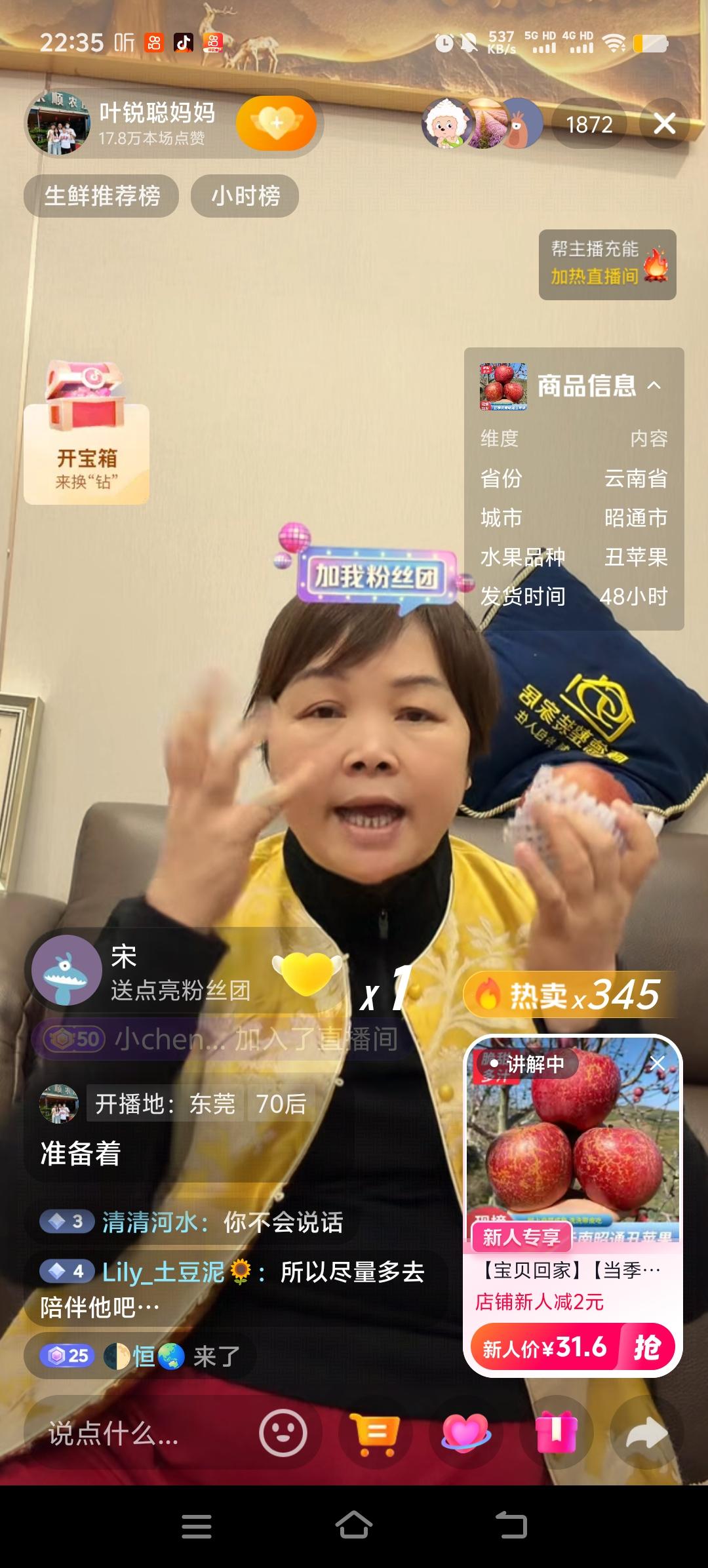 叶锐聪的妈妈在直播间和大家聊天时,顺便小黄车上了云南昭通苹果。有网友询问她儿子为何在视频里遮住脸,不与大家相见。叶锐聪妈妈称,儿子目前还不够自信,她打算等儿子十足自信后,再让他和大家见面,当下她只想好好保护儿子。这真是一位聪慧睿智的妈妈,为睿智的冬姐点赞!
