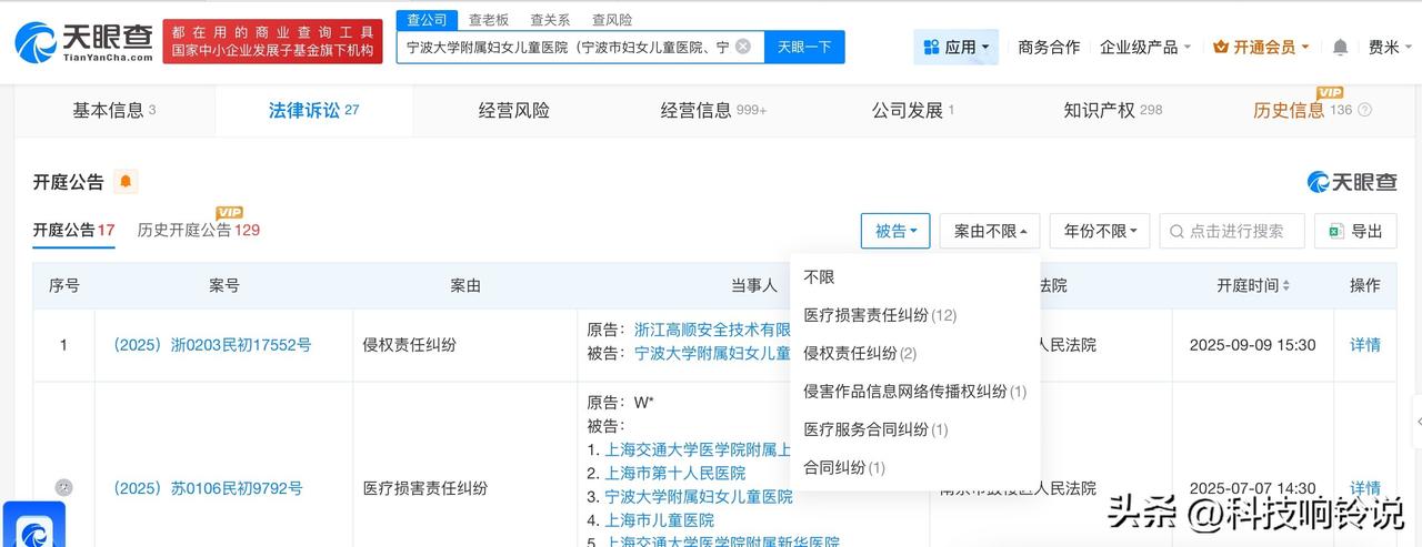 【揭秘宁波患儿手术后离世涉事医院 宁波妇儿医院涉多起医疗损害责任纠纷】宁波通报患儿手术后离世 据媒体报道,2025年11月14日晚,患儿许某某在宁波大学附属妇女儿童医院接受心脏手术后不幸离世。宁波卫健委发布通报称,多人被处理。 天眼查App显示,涉事医院宁波大学附属妇女儿童医院(宁波市妇女儿童医院、宁波市妇幼保健院)法定代表人为陈长水,注册资本约10.1亿人民币,经营范围包括主要承担本地以妇产科、儿科为主的常见病、急危重症和疑难病症的诊疗服务等。法律诉讼信息显示,该医院曾多次因医疗损害责任纠纷、医疗服务合同纠纷等被起诉。 天眼查信息: