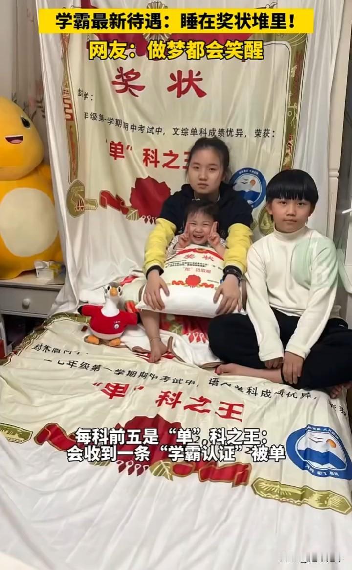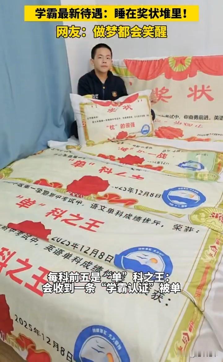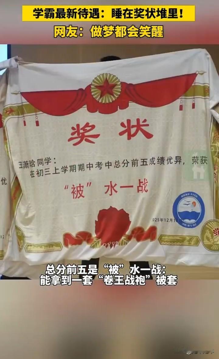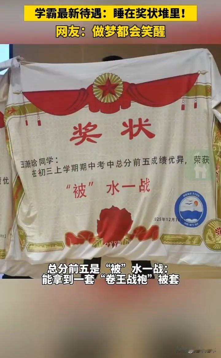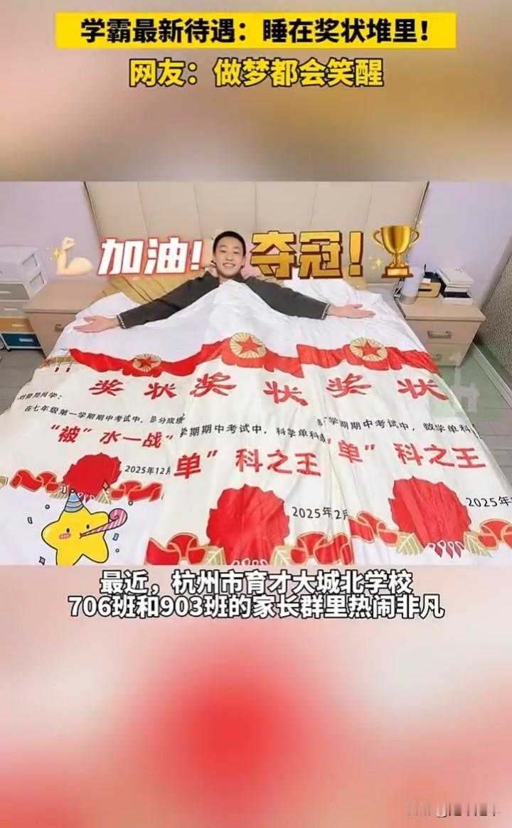 这样的奖励也太可怕了吧,杭州的学校发给优秀生“床单枕套”!!😂😂 杭州市育才大城北学校区,给每科前五名的学生发放一条“学霸认证”被单枕套。 分别有给总分前五的“被”水一战,能拿到一套“卷王战袍”被套。总分进步前五是“枕”的很强,能把“成长之枕”抱回家。单科进步前五是“毯”为观止,“进步之神”毛毯是进步奖励。还有最佳值日生拿到的奖品是光芒“碗”丈。最佳课代表奖品是梳子知“梳”达礼。最佳小组拿到的是抱枕,抱团取暖。由于这些奖项不限制重复领用,所以有些孩子都恨不能一口气拿一整套回家,到家甚至没洗就想着用上了。 这波奖励直接把仪式感和实用性焊死了,比轻飘飘的纸质奖状戳人多了。这种特殊奖励让孩子的努力被家人看见,激励效果直接翻倍。还能悄悄给家长们亲子话题添了燃料,这样操作太懂学生心理了。 纸质奖状可以敷在墙上慢慢的变老旧。而印着名字的被单、枕头却能每天使用,睡觉都裹着荣誉。而且这些奖品都还有谐音梗的寓意在里头,孩子能不开心吗?这样的奖品把激励学生的信息悄悄地藏在生活用品中,比啥大道理都管用,这样的暖心创意值得全国推广! 小学生精神奖励 课堂奖励方式