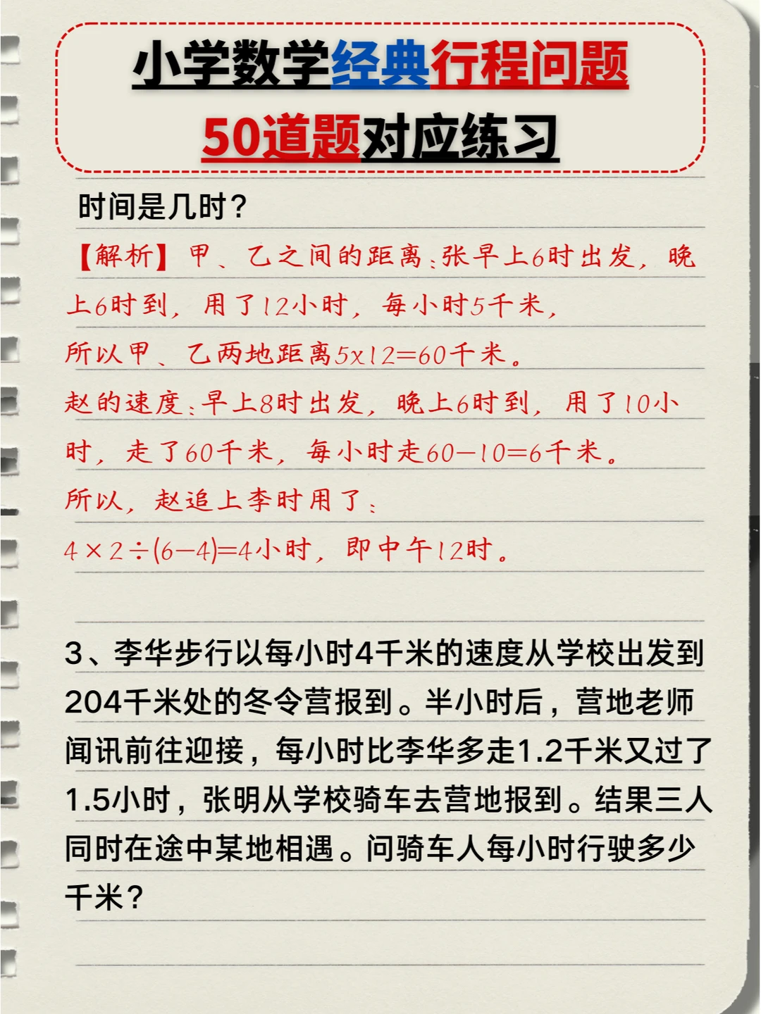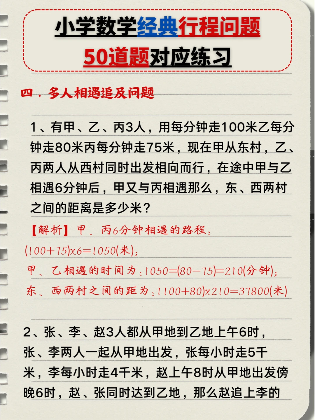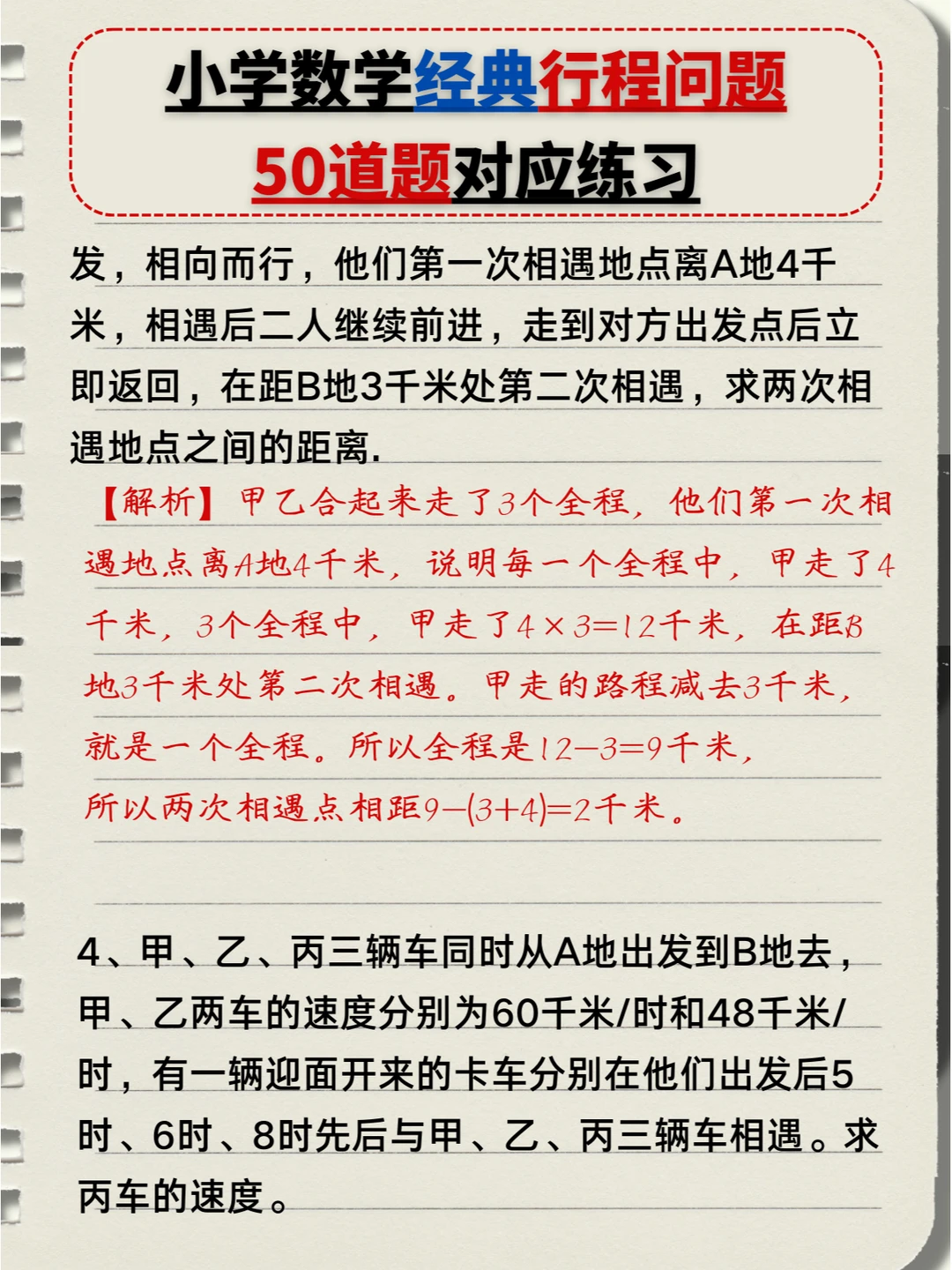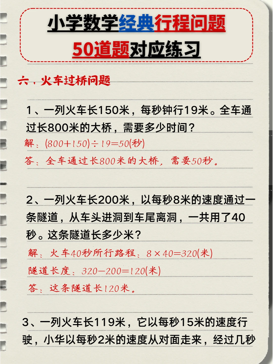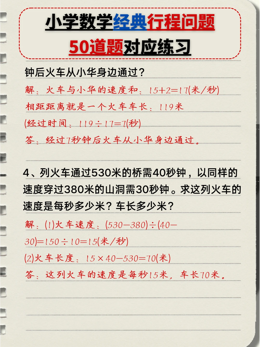 🔥小学数学:经典行程问题🔟类题型,5️⃣0️⃣道题对应练习题+答案💯(中) 👉本次对应题型练习: 4️⃣、多人相遇追及问题 5️⃣、多次相遇追及问题 6️⃣、火车过桥问题 7️⃣、火车追及问题 👉上次对应题型练习: 1️⃣、简单相遇及追及问题 2️⃣、流水行船问题 3️⃣、环形跑道问题