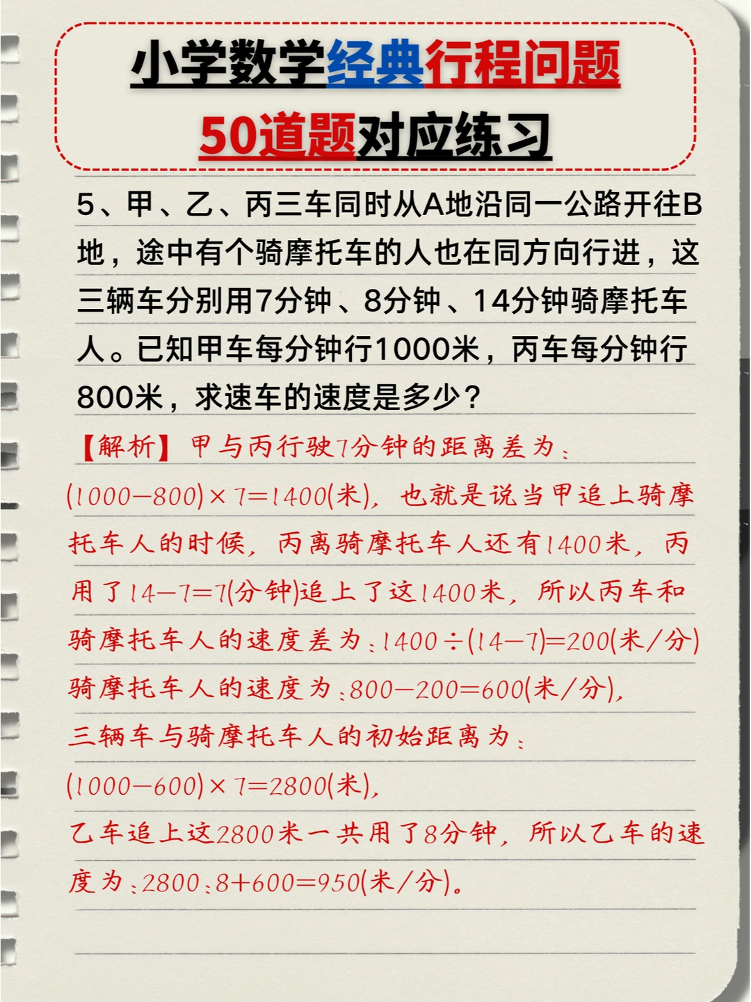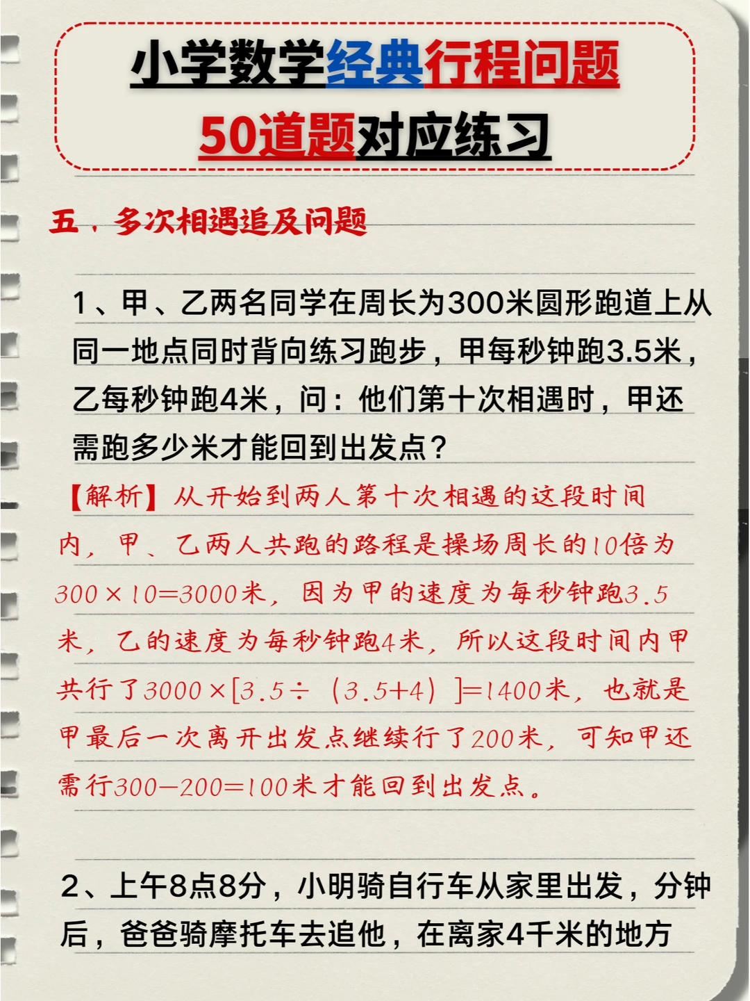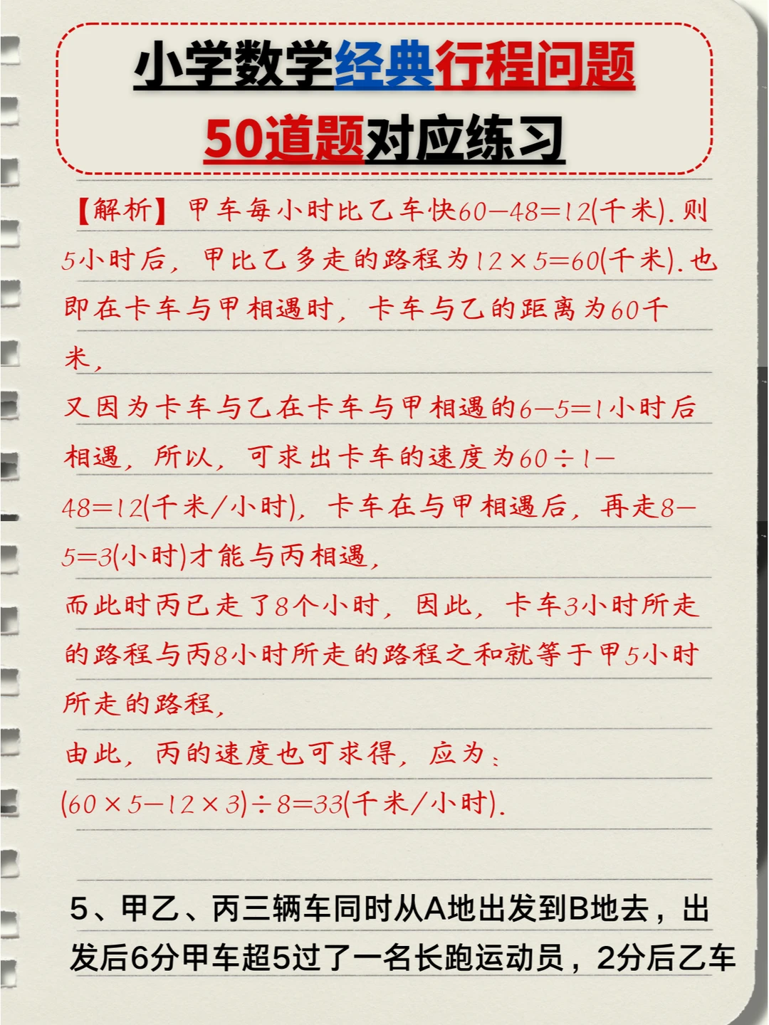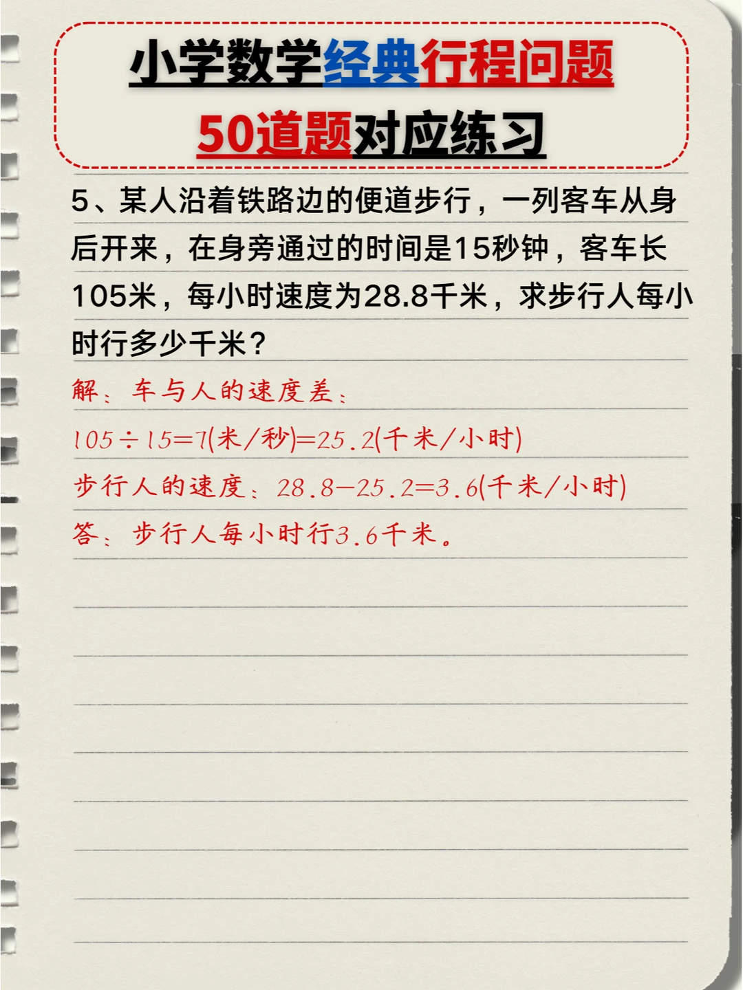 🔥小学数学:经典行程问题🔟类题型,5️⃣0️⃣道题对应练习题+答案💯(中) 👉本次对应题型练习: 4️⃣、多人相遇追及问题 5️⃣、多次相遇追及问题 6️⃣、火车过桥问题 7️⃣、火车追及问题 👉上次对应题型练习: 1️⃣、简单相遇及追及问题 2️⃣、流水行船问题 3️⃣、环形跑道问题