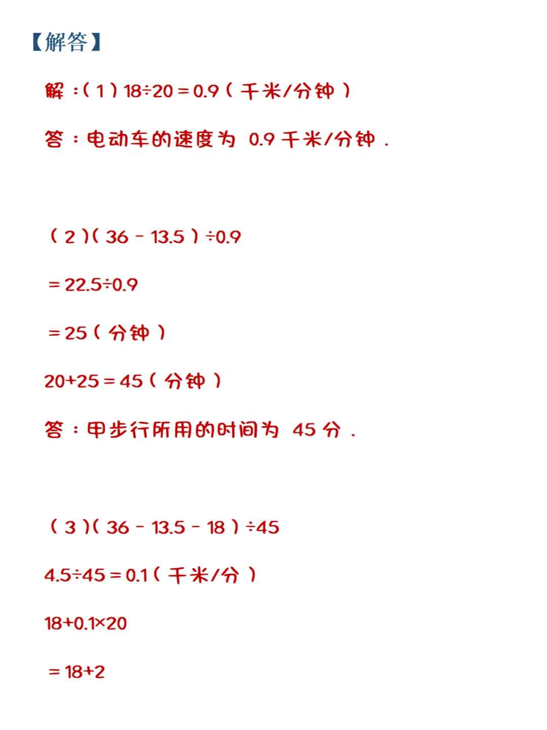 📚重庆小升初:区重点名校压轴真题练习💯 📍【思路点拨】 (1)根据速度=路程÷时间,求出电动车的速度即可; (2)先求出乙追上甲所用的时间,再加上乙返回学校所用的时间就是甲步行所用的时间; (3)先根据第二问的结论求出甲步行的速度,就可以求出乙回到学校时,甲与学校的距离;据此解答即可.