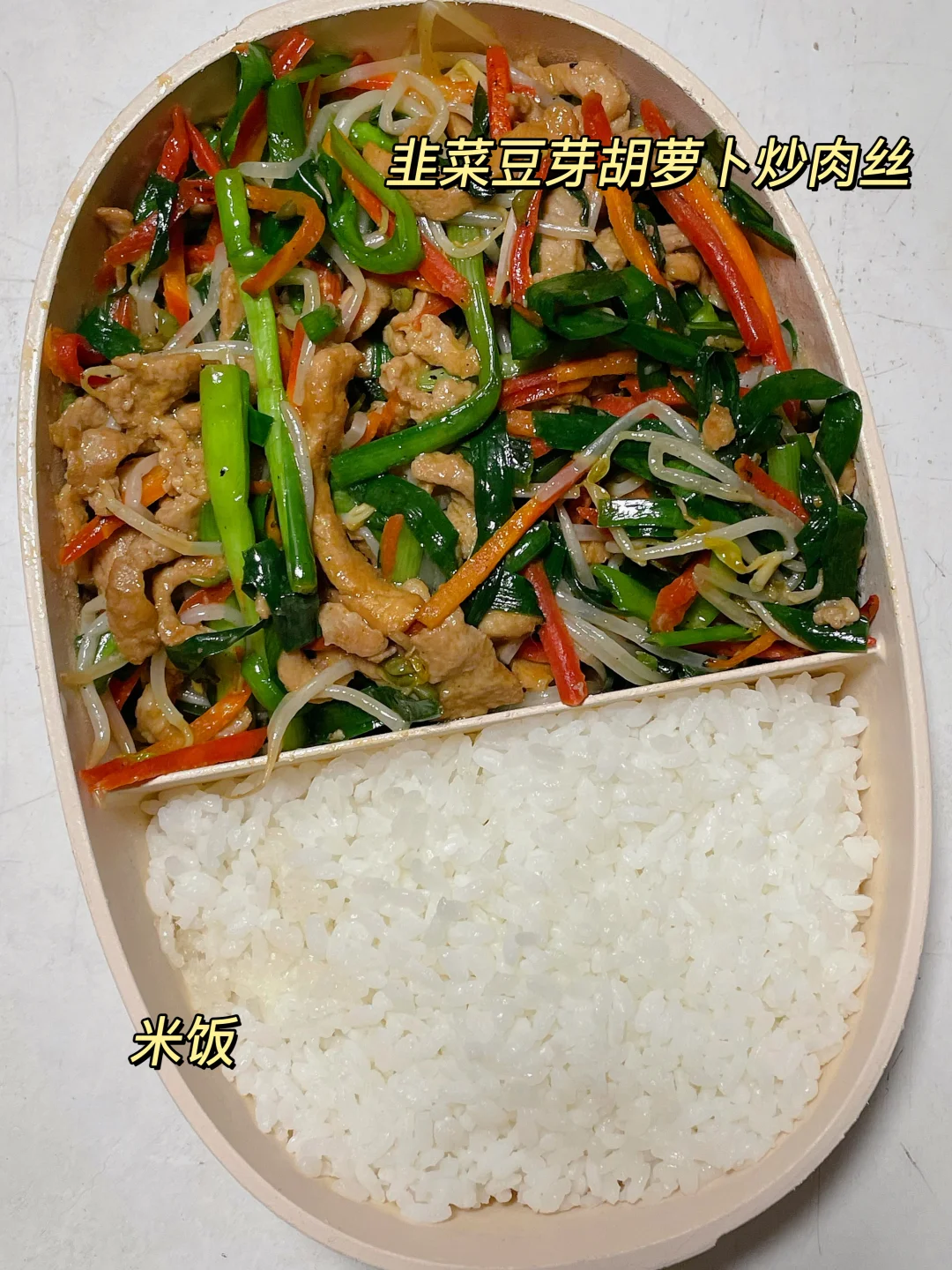 📍米饭+韭菜豆芽胡萝卜炒肉丝