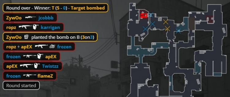 来到长枪回合,apex在A大门先被烧掉,ropz联手Zywoo三杀进A,broky在A小被Zywoo一把AK混烟带走,寒王6滴血保枪,小蜜蜂拿到第3分。FaZe继续存钱,寒王英雄M4,总监与大表哥中路沙鹰双架打掉火仔与apex,Zywoo大狙双杀进B下包,ropz偷掉broky,Zywoo大狙被C4炸飞,小蜜蜂拿到第4分。