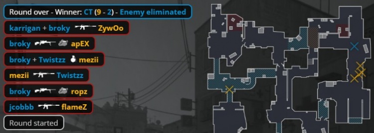 半场结束前小蜜蜂骚扰A小真打B点,总监独自看B双杀联手回防的总监双人四杀,broky大狙轰掉火仔,FaZe以3-9结束上半场。