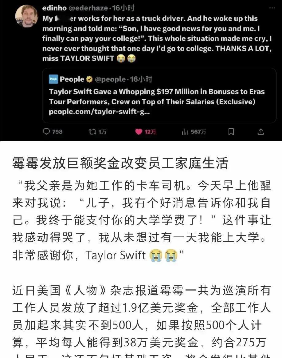 她给卡车司机发了50万美元奖金。是的,就那个开卡车的。 不是年终奖,是额外分红。巡演票房破12.8亿美金后,泰勒·斯威夫特转身给394名员工发了1.97亿。包括52名卡车司机。每人税前50万,附赠卡地亚手链。团队蹲在路边数钱的照片昨天刷屏了。 这钱怎么来的?她撕毁了行业惯例。普通巡演员工年薪6.8万,她团队底薪15万。票房超额完成,按合同她可以独吞利润。但她选了另一条路:让普华永道设计分红方案,把奖金包装成“绩效激励”。税后每人到手32万美金。 卡车司机为什么值这个价?她的巡演器材装满45辆卡车,跨越三大洲。司机要保证每场搭建误差小于3分钟。悉尼站暴雨,车队硬是提前47分钟到场。这些细节观众看不见,但算法记住了——每场准点率直接关联她的演出口碑。 现在行业炸了。环球音乐连夜修改巡演合同,把团队分红列为必选项。同行艺人接到员工电话:“为什么我们不能像泰勒团队那样?”这不是慈善,是商业逻辑重构:她把团队从成本变成投资方。 当你把送咖啡的助理和调音响的技师都变成合伙人时,你买的不是忠诚,是共识。昨天那52个司机拿到支票后,自发把卡车洗了三遍。