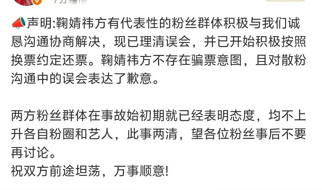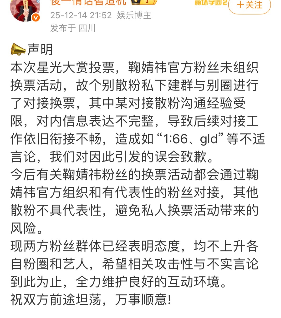 鞠婧祎方对星光大赏投票争议回应,和魔道祖师粉换票是散粉行为,魔道粉也澄清了橘丝不存在骗票意图,双方已沟通不再升级矛盾和上升艺人,以后有类似活动由官方直接对接!