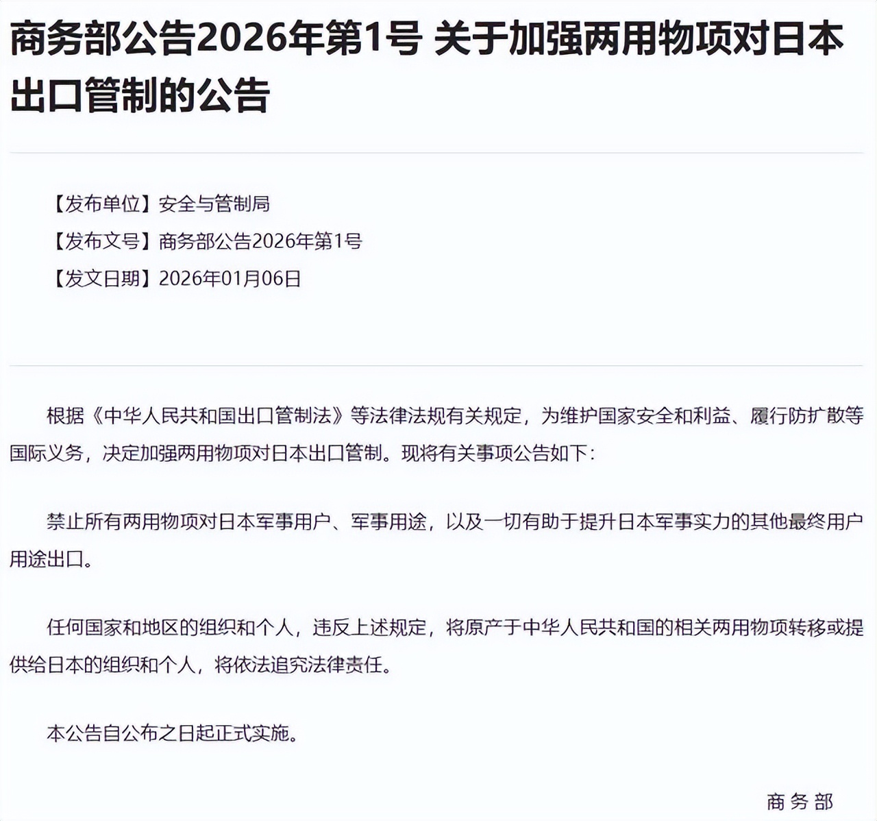 商务部1号公告直击日本命脉2026年1月6日,中国商务部发布2026年第1号公告,宣布加强两用物项对日本出口管制。公告当即生效,没有缓冲期。所谓两用物项,指既有民用又有军事用途或有助于提升军事潜力的货物、技术和服务,包括相关数据。