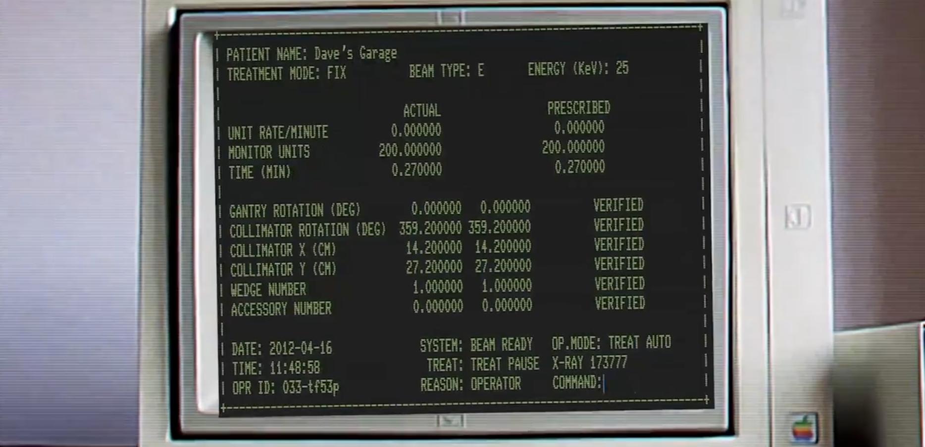 他直接就躺进25号机里面,然后医生就开始操作电脑。治疗模式,电子束。剂量,180拉德。当参数设置完成之后,系统显示参数正确、设备就绪。随后,医生就按下了启动电子束按钮。可是随着机器的启动,屏幕上却出现了“故障54”的代码。