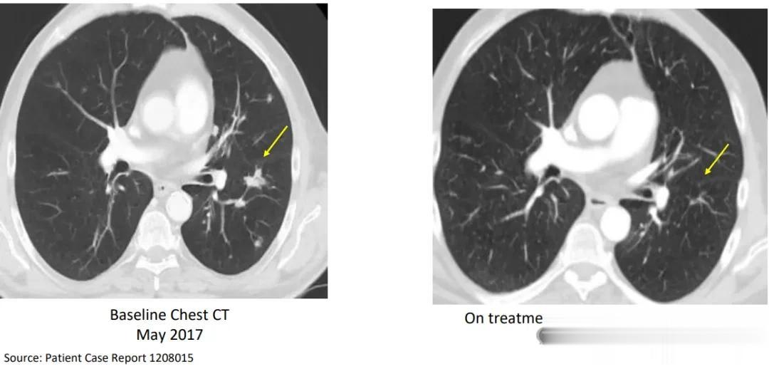1名54岁的晚期肺癌患者在经过5次的新型肺癌疫苗注射后,肿瘤就迅速萎缩,靶病灶总和减少41%(直径从39mm降至23mm),截止报道时,生存期已经超过20.6个月,目前仍在随访中。
