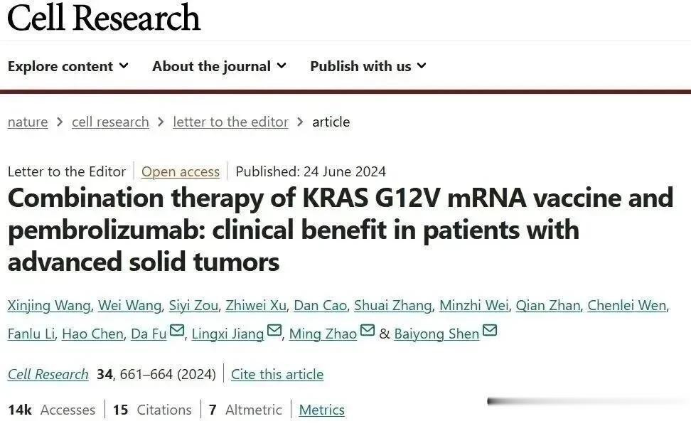 2024年6月24日,由我国知名医疗团队在国际医学顶刊《Cell Research》发表了报道了mRNA肿瘤疫苗研究新进展:在全球范围内首次报道针对KRAS G12V单靶点的mRNA肿瘤疫苗在实体肿瘤中的治疗效果,为传统治疗无法耐受或者耐药的晚期肿瘤患者带来新希望。