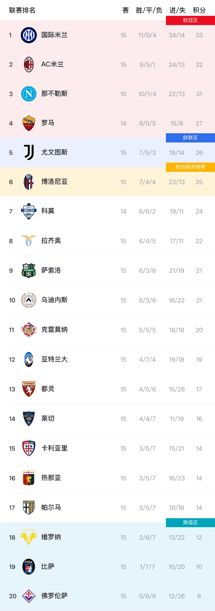保级端紫百合本轮主场1-2不敌维罗纳后依然深陷垫底区;比萨、维罗纳分列倒数第二、第三,分差不大,卡利亚里、热那亚和帕尔马同积14分,仅比降级区高2分。