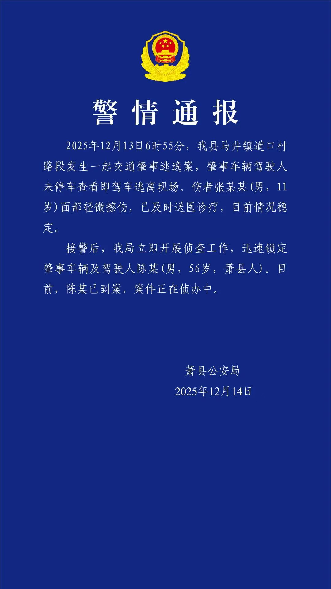 安徽萧县警方通报一起交通肇事逃逸案:11岁伤者情况稳定,肇事驾驶人已到案