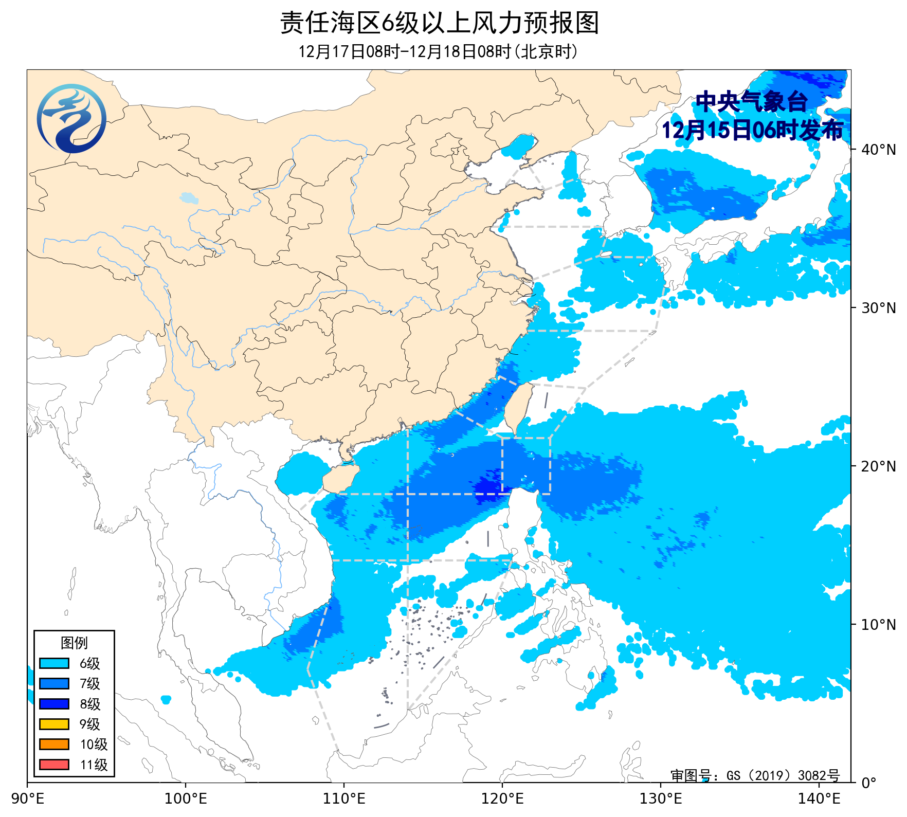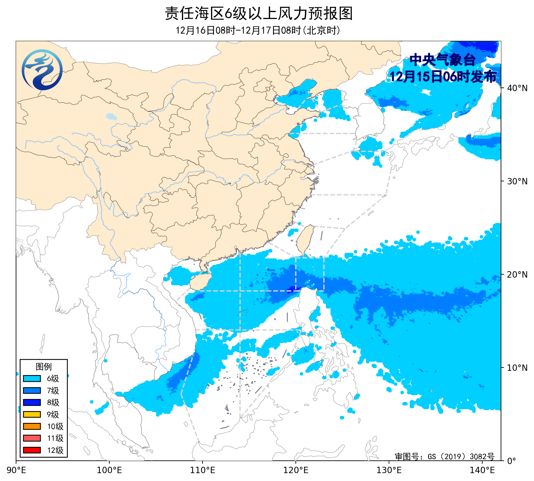 12月14日14时至15日02时,黄海大部海域、东海大部海域、台湾以东洋面、南海西南部海域出现了5~7级、阵风8级的偏北风或西北风,台湾海峡、巴士海峡、南海东北部海域、南海中西部海域出现了6~8级、阵风9级的东北风,南海西北部海域、北部湾、南海东南部海域出现了5~6级、阵风7级的东北风。