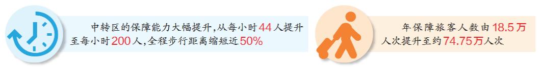在高峰期,该中转区的保障能力大幅提升,从原来的每小时44人提升至每小时200人,全程步行距离缩短近50%,年保障旅客人数由原来的18.5万人次提升至约74.75万人次。这一变化,让旅客的出行更加从容。