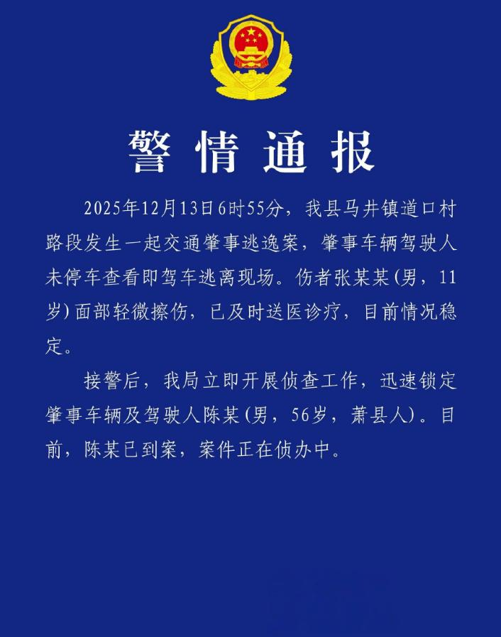 “2025年12月13日6时55分,我县马井镇道口村路段发生一起交通肇事逃逸案,肇事车辆驾驶人未停车查看即驾车逃离现场。伤者张某某(男,11岁)面部轻微擦伤,已及时送医诊疗,目前情况稳定。