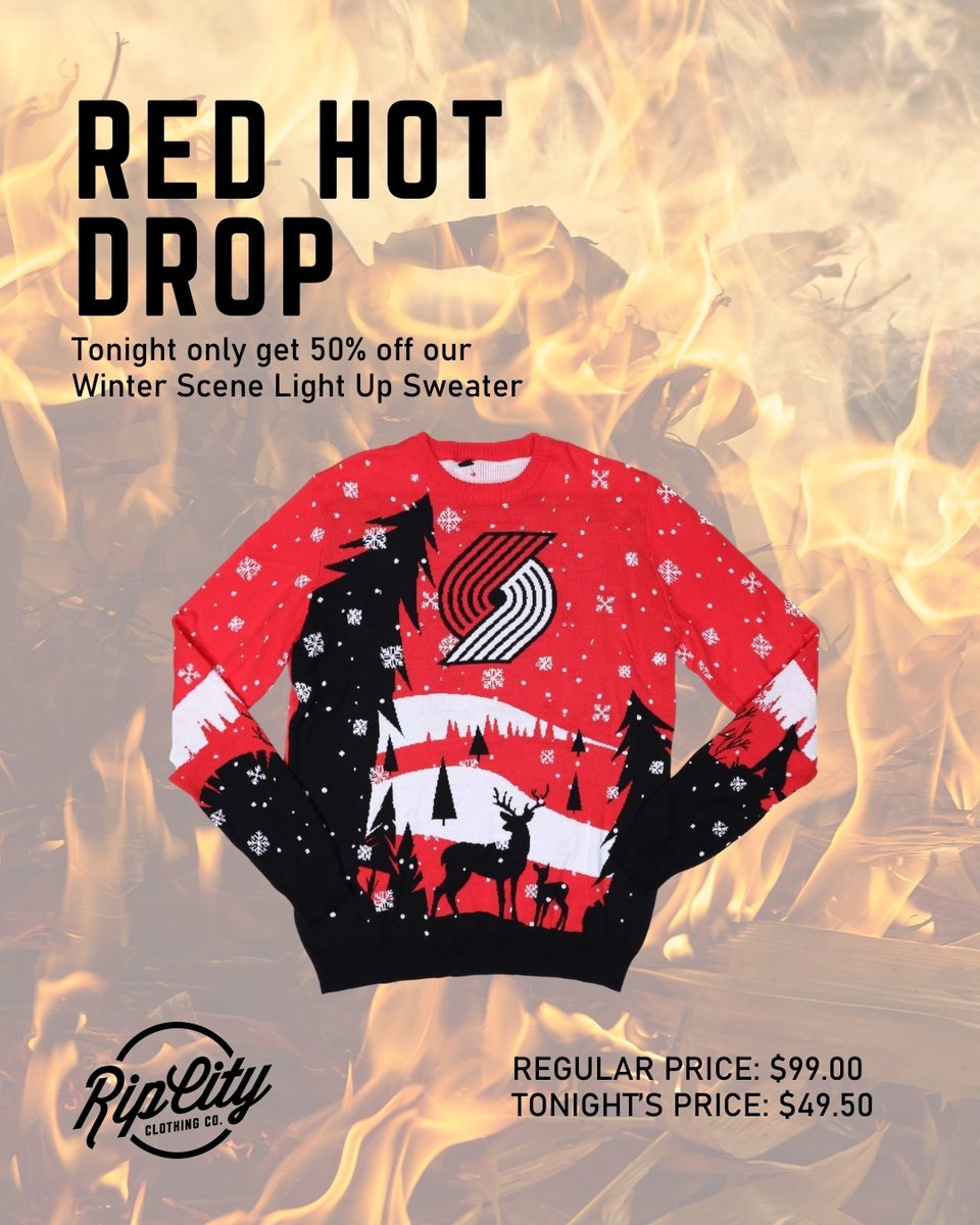 开拓者官方账号报道,今晚的RedHotDrop活动已正式上线🚒。仅限今晚,冬季场景发光毛衣可享5折优惠🌲🌨。现已在RipCityClothing(A-19入口)或通过有售。