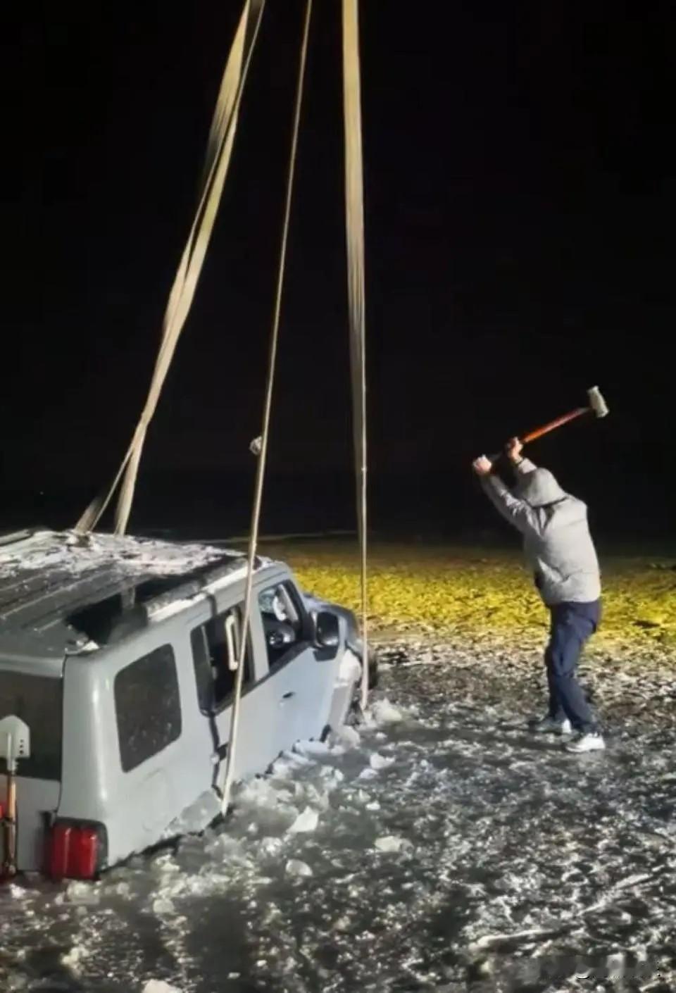 冰面耍酷变“冰雕”!越野车水库漂移玩脱,吊车锤凿鏖战6小时救“冻”车 12月13日下午,某水库的冰面成了“舞台”。一辆越野车呼啸着玩起了漂移,轮胎摩擦冰面的刺耳声回荡。可帅不过三秒,开到水库中央时,惊悚一幕发生了——只听“咔嚓”一声脆响,看似厚实的冰层瞬间裂开巨口!整辆车猛地一沉,四个轮子直接陷进刺骨冰水,被牢牢“冻”在了冰窟窿里,动弹不得。 从“炫技达人”秒变“冰封展品”,这画风突变得让围观者和网友都傻眼了。视频记录下它孤零零卡在冰水中的狼狈样,周围尽是碎裂的浮冰。 救援可成了大工程!天色渐暗,气温骤降,吊车轰鸣着抵达现场,试图将这头“钢铁困兽”拖出冰窟窿。然而,车轮早已与冰层死死冻为一体。救援人员抡起锤子、钢钎,在刺骨寒风中一下下奋力凿击车轮周围的厚冰,冰屑飞溅。吊车钢丝绷得笔直,一次次尝试发力…… 这场冰与铁的拉锯战整整持续了6个多小时!终于在深夜11点30分,伴随着现场人员的欢呼和吊车的轰鸣,越野车被硬生生从冰棺材般的窟窿里“拔”了出来。万幸,没有人员伤亡,但这场惊魂救援的代价,恐怕够车主反思一阵子了。 冰面不是游乐场!这次惊险救援,给所有试图在野冰上“撒野”的人敲响了刺耳的警钟:耍酷有风险,漂移需谨慎,代价可能远不止一辆车!冰面冒险?劝你三思!