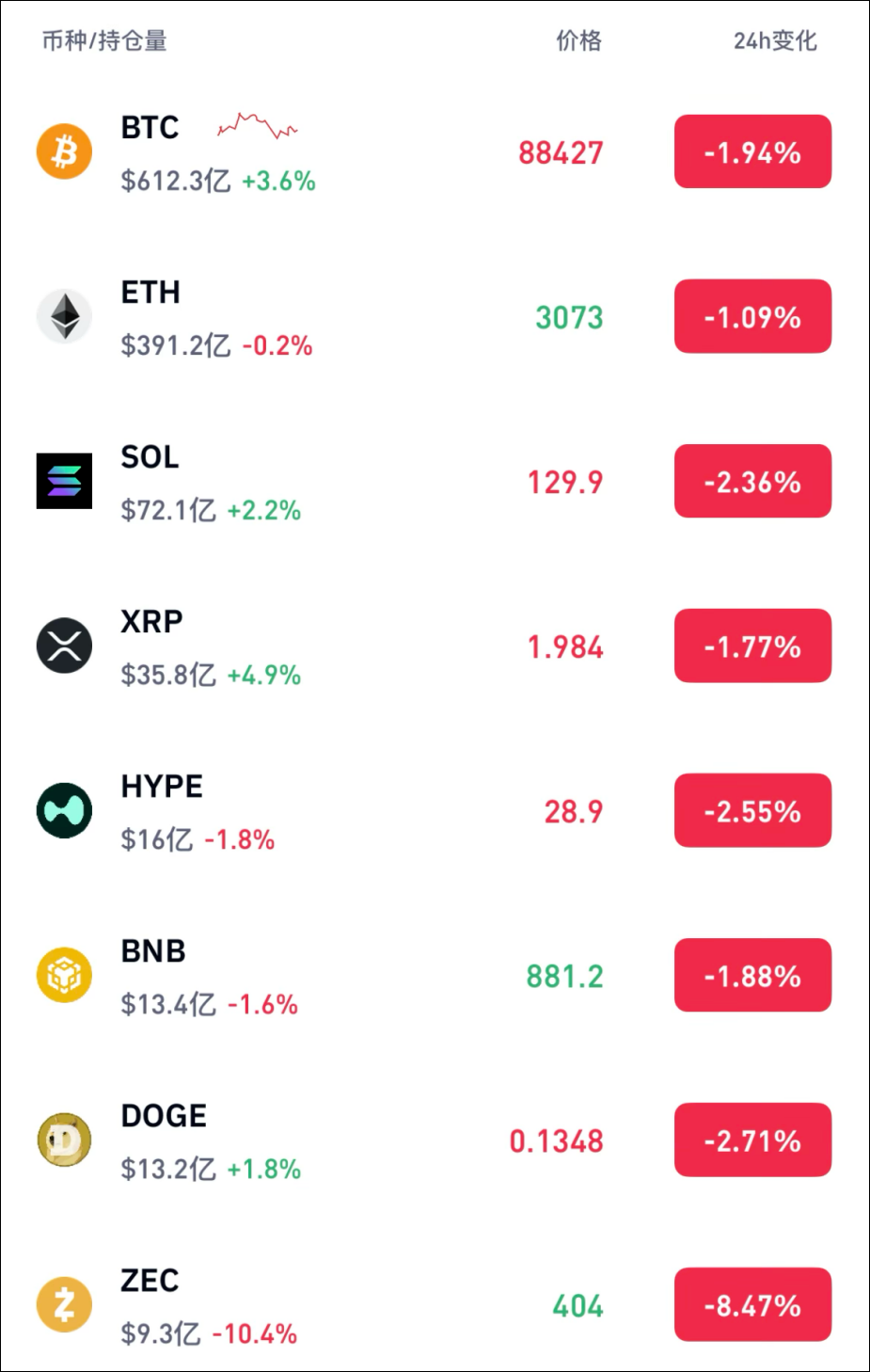北京时间12月15日早间,加密货币市场普遍走弱,比特币跌破8.8万美元/枚关口,24小时跌幅达2.43%。