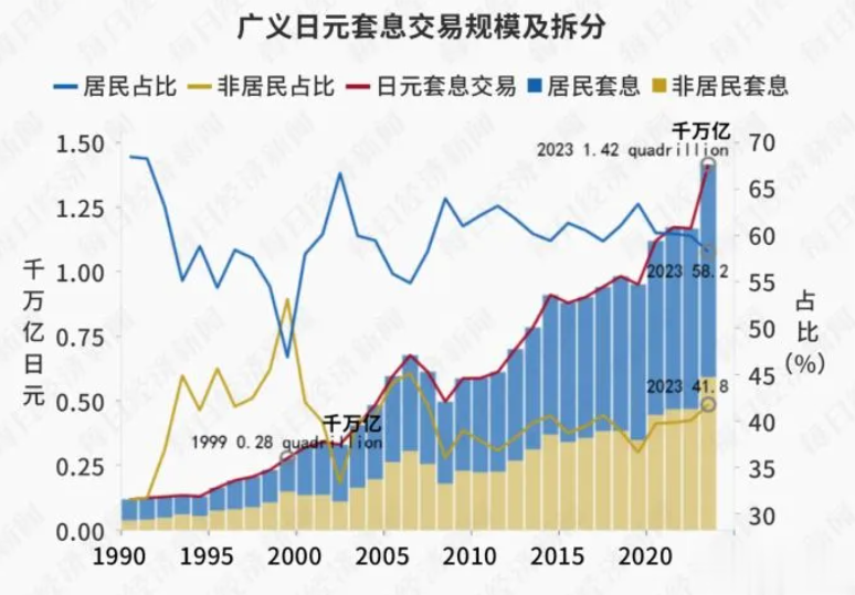 美日政策的反向操作正在重塑全球资本流动格局。招商银行研究院报告显示,截至2023年末,广义日元套息交易规模已达1420万亿日元(约合9.3万亿美元),相当于当时日本经济总量的236%,占全部日元负债的13%,影响着日本股市逾30%的市值。长期以来,投资者借入低息日元投向美欧等高息资产,形成庞大的跨境套利资金池。如今日美利差收窄至3个百分点以内,套利空间急剧压缩,资金回流日本的趋势已初现端倪。