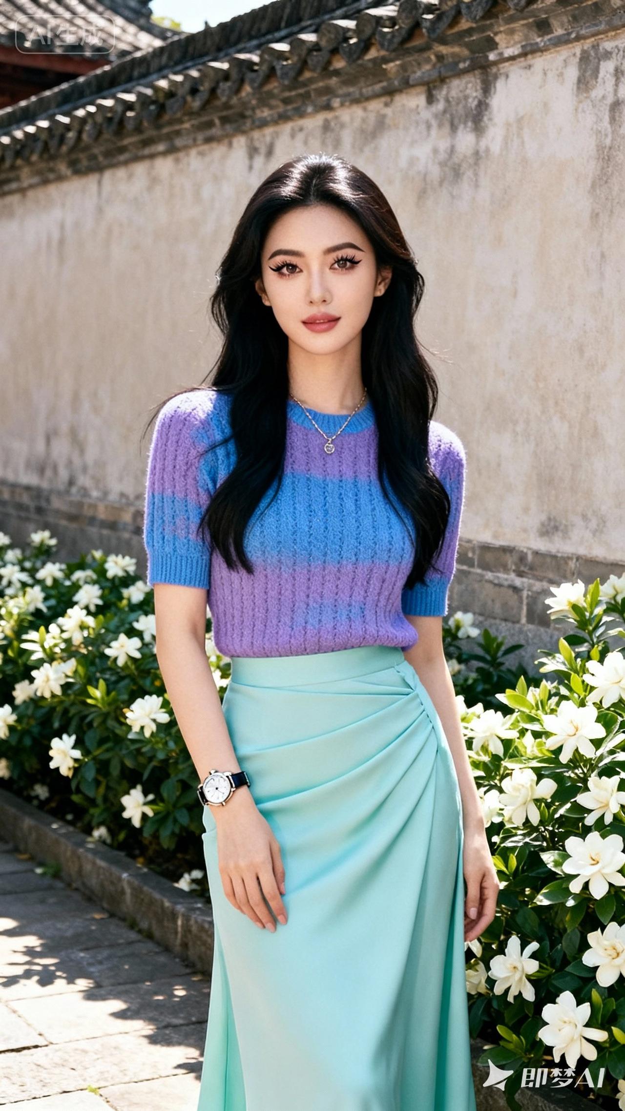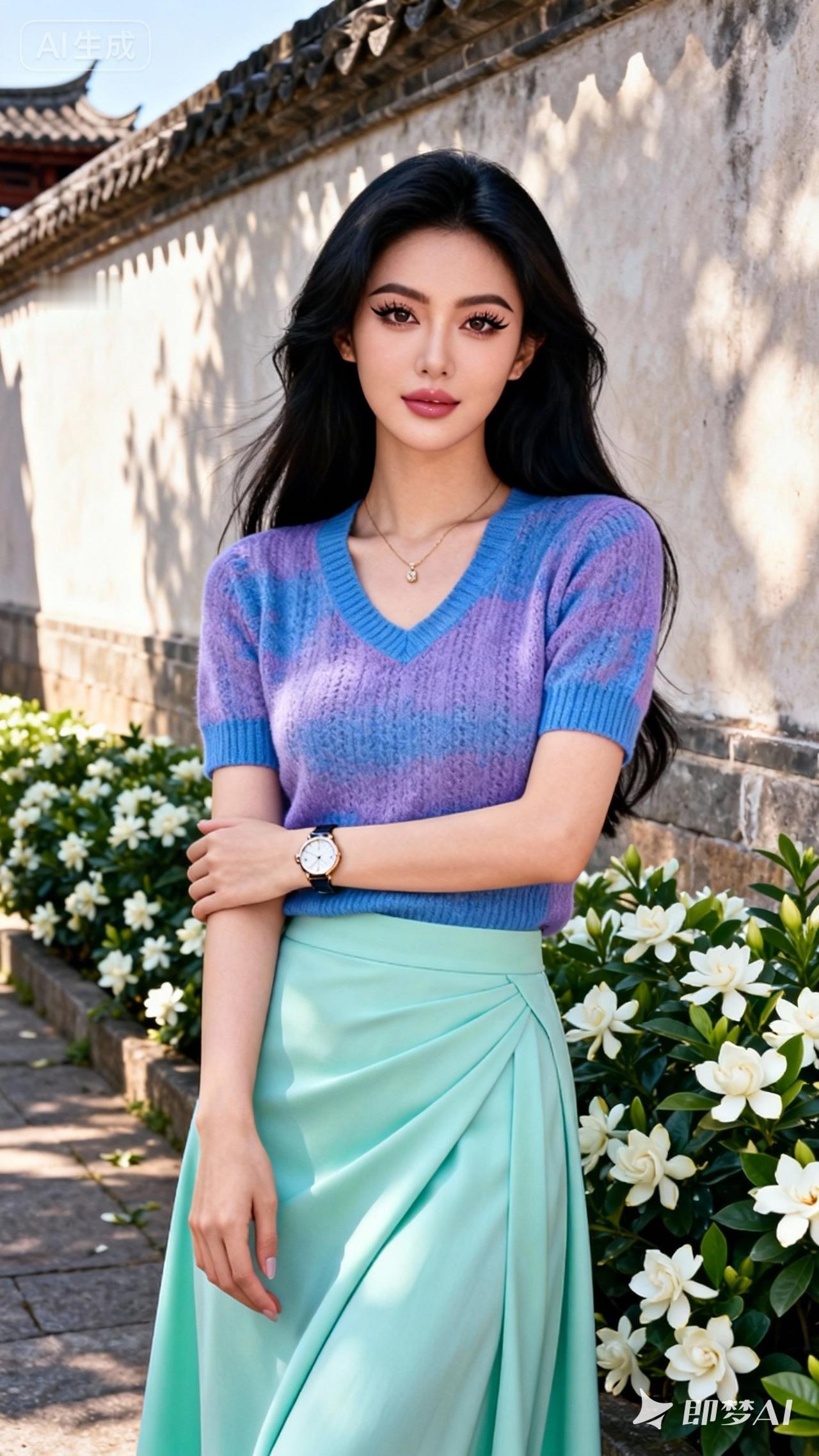 古风庭院中的清新少女,蓝紫色毛衣搭配薄荷绿长裙,优雅动人。