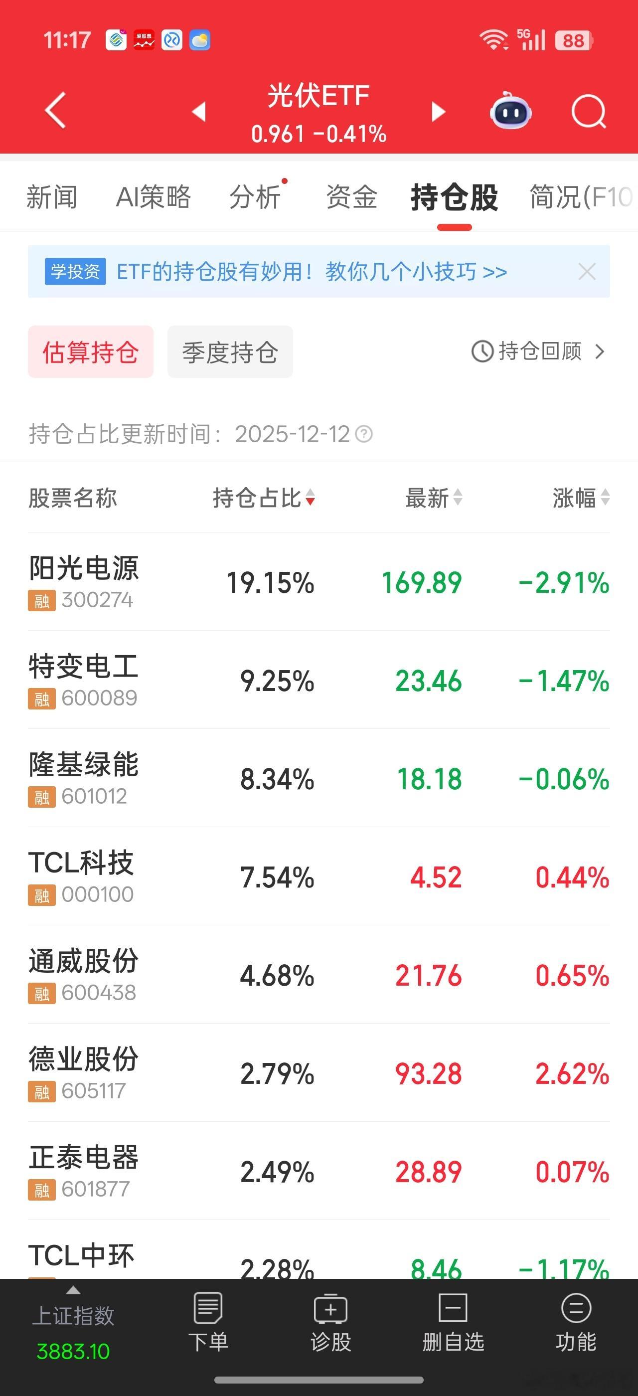 东方日升这个大单驱动的20cm似乎对板块带动力有点弱。。。不过也说明20cm修复也真是快。。差2分钱就反包了。。可惜对储能,对光伏板块带动效应差了点。。主要还是因为光伏ETF里,阳光电源占权重太高了,19.15%。。。。这些ETF权重比例也该优化调整一下。。。应该控制单一个股不能超过10%光伏ETF权重前三都是绿的,结果就把这个ETF带绿了东方日升占比才0.78%,20%涨幅,抵不过阳光电源一个-2%的下跌