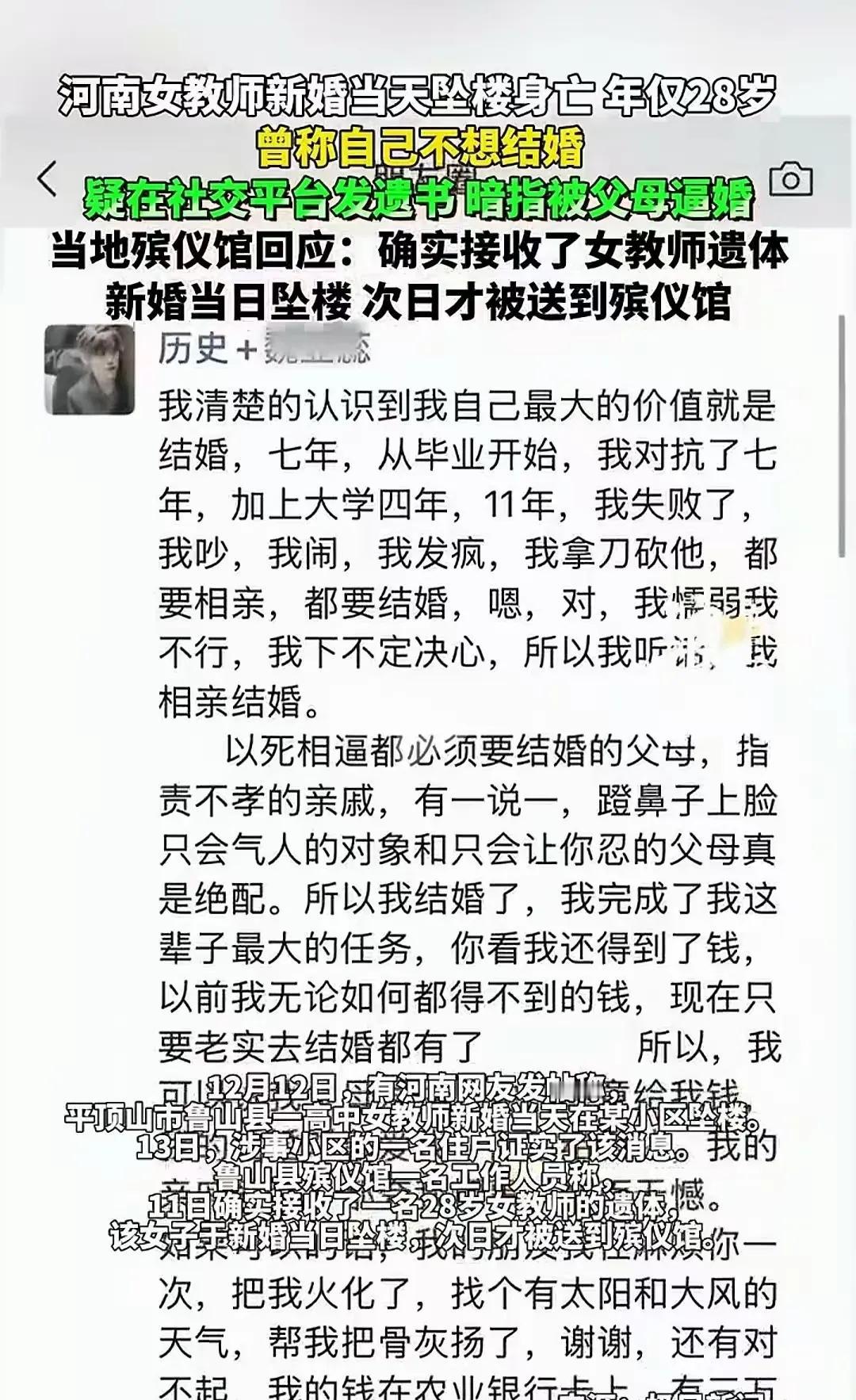 28岁女教师新婚当天穿婚纱坠楼!这事儿听着头皮发麻,又气又心疼! 这姑娘多好啊,高中历史老师,学生都说她善良漂亮,讲课还带笑。可她打心底里不想结婚,全是被父母逼的,生前朋友圈都明说自己不想嫁,对抗这么久还是没逃过。 说真的,我真纳闷她咋就这么傻!不想结就不结啊,逃呗、走呗,换个城市重新开始,总比丢了性命强!还有那新郎,也不是啥躺着中枪的冤种,大概率也收了彩礼,不然哪能这么顺理成章办婚礼? 她天天在讲台上教学生别被封建糟粕绑住,结果自己反倒被“必须结婚”的枷锁勒死了,多惋惜!新婚当天本该是好日子,却成了生命终点,双方家庭还在推诿责任,真是寒心透顶。以爱为名的逼迫根本不是关怀,是实打实的伤害!婚姻从来不是人生必选项,为啥非要逼孩子走上绝路? 28岁女教师新婚坠亡 拒绝封建逼婚 婚姻自由不该是口号 到底要多少悲剧发生,父母才肯放下“为你好”的绑架,让孩子自己选人生?