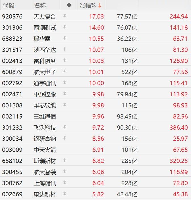 格隆汇12月15日|A股市场商业航天股再度集体爆发,截至半日收盘,天力复合涨17%,西测测试涨超14%,瑞华泰、陕西华达涨超10%,雷科防务、航天电子、通宇通讯、中超控股、华菱线缆、三维通信10CM涨停,飞沃科技涨超9%,钢研高纳涨超8%,中天火箭、斯瑞新材、航天智装、上海瀚讯涨超6%。
