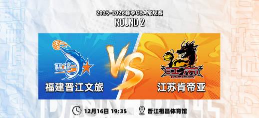 赛前,江苏男篮官方发布赛事预告,并配文道:"赛事预告:常规赛ROUND2,比赛时间:2025年12月16日(周二)19:35,福建男篮,比赛地点:晋江祖昌体育馆,一起为肯帝亚男篮加油助威!"