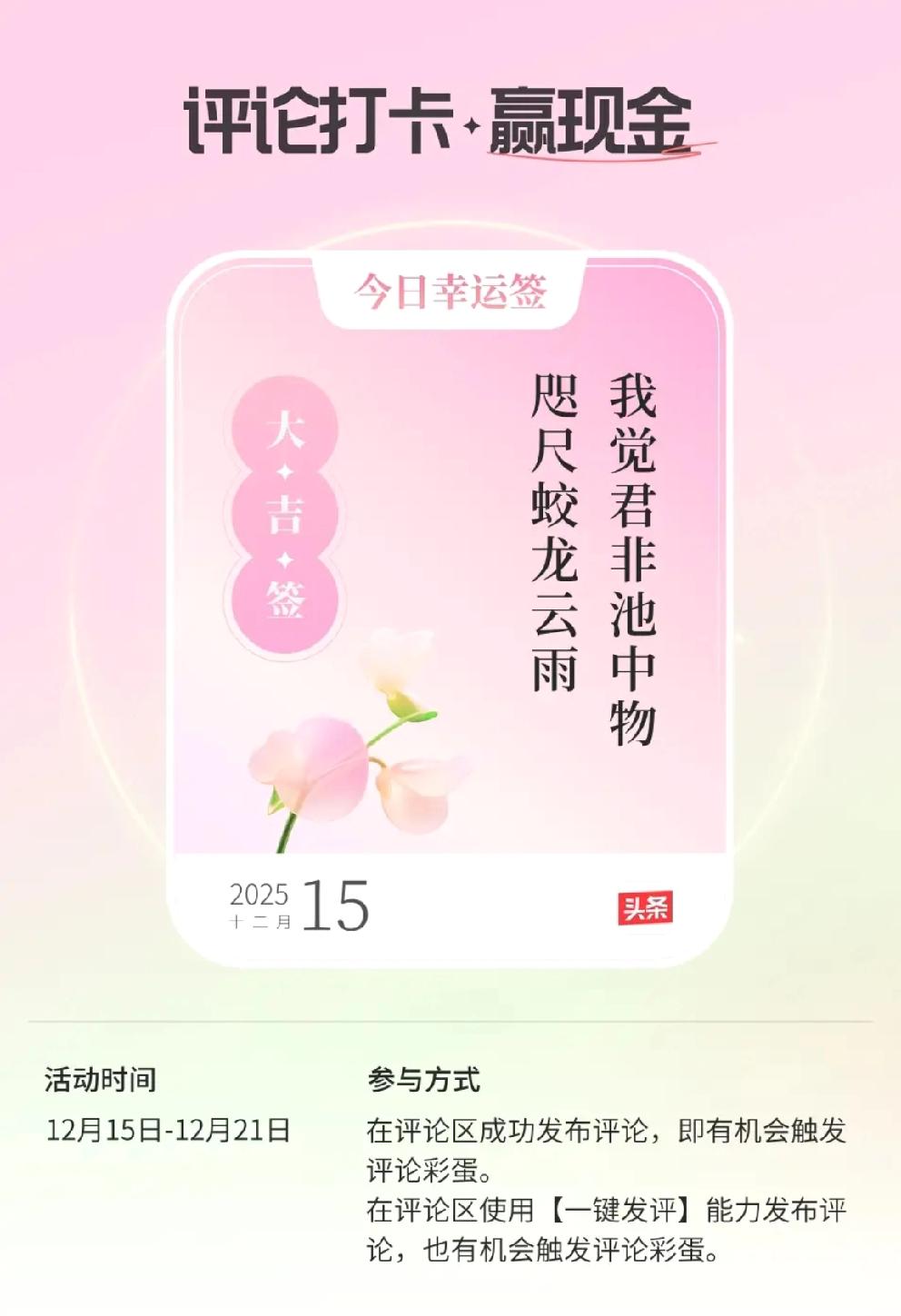 哈哈,原来在头条评论也能领“幸运签”,像开盲盒一样有趣!我也去试试手气,说不定惊喜就藏在下一句留言里。
