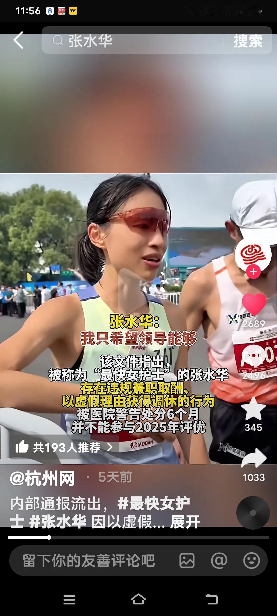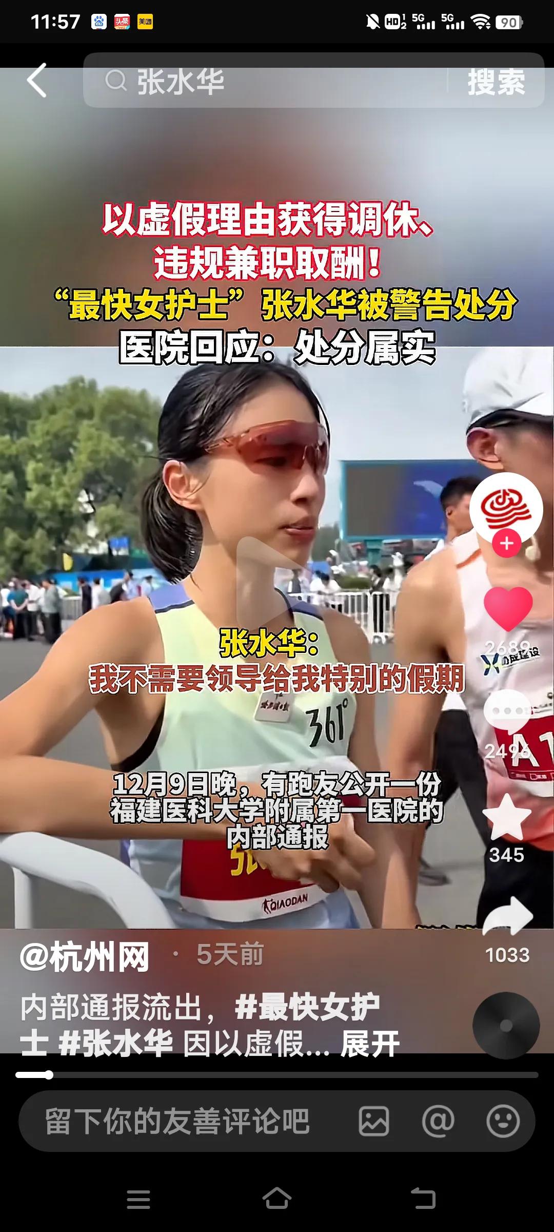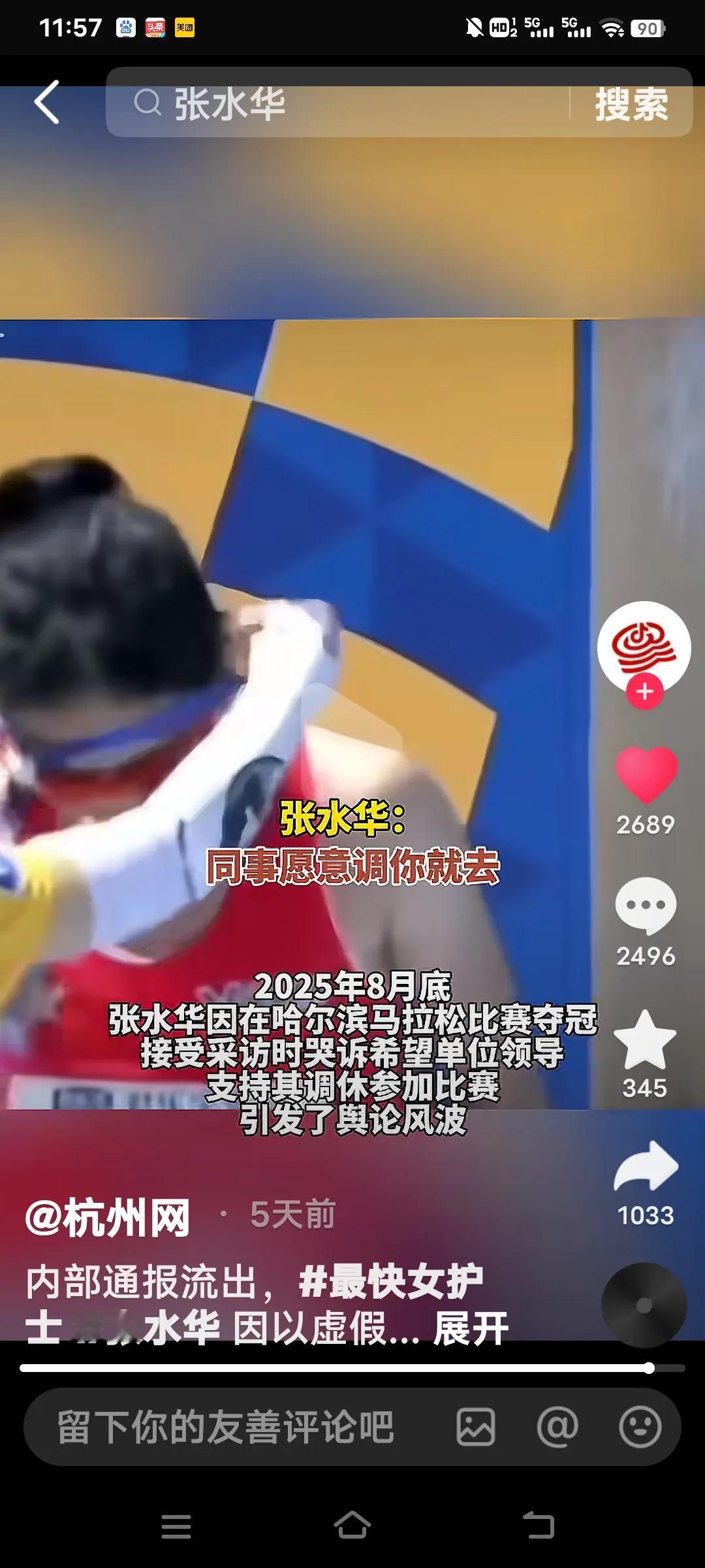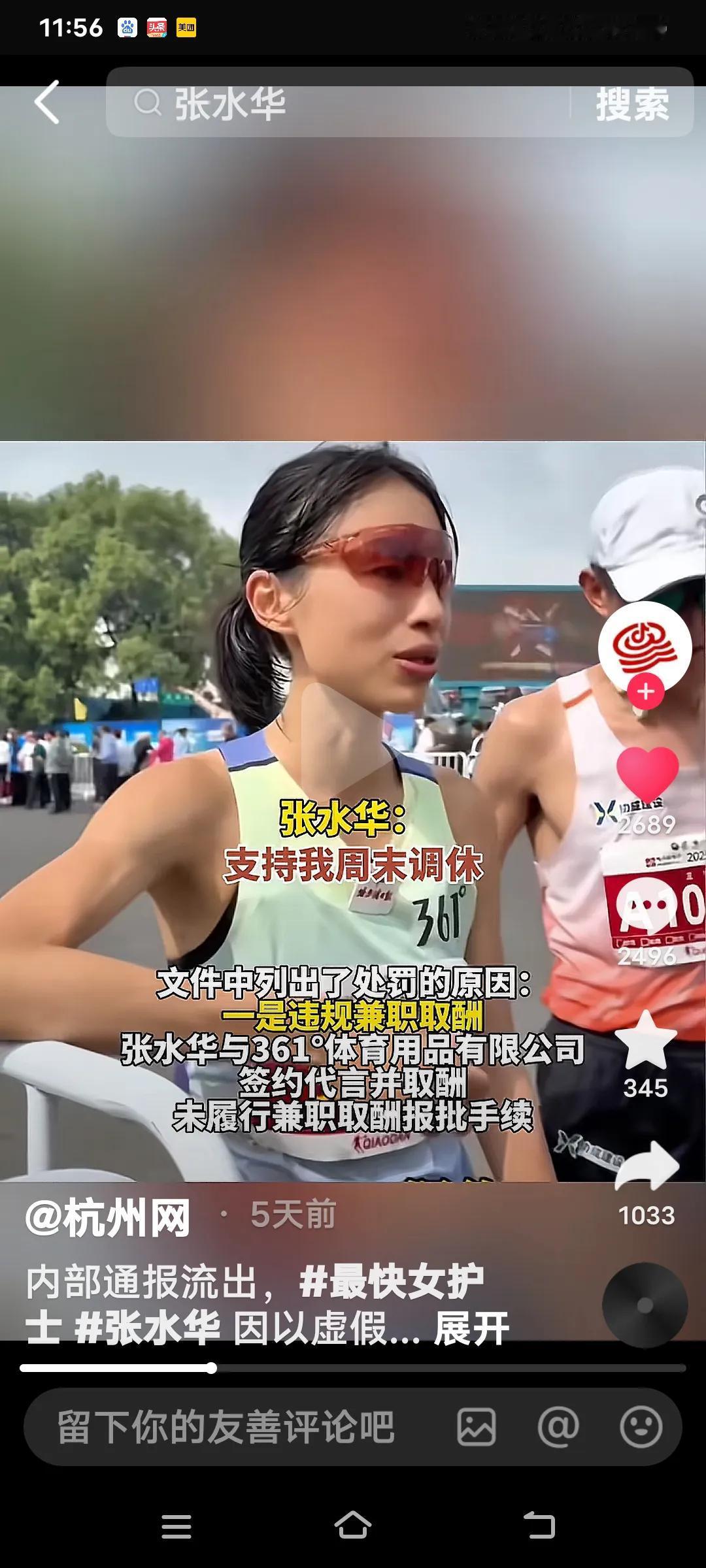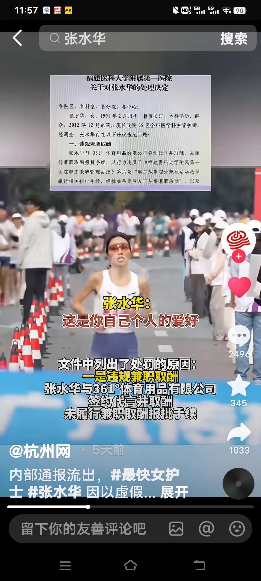 “最快女护士”张水华的事儿最近闹得沸沸扬扬。她在马拉松赛场那叫一个厉害,多次夺冠,近50天参加5场比赛,奖金超20万,这奔跑的劲头确实展现了追梦的执着。 可她为了参赛,违规兼职取酬、用虚假理由调休,影响了正常医疗秩序,最终被医院警告处分6个月,还不能参与2025年评优。 她曾哭诉求调休引争议,虽然后来道歉说会分清工作与爱好,但“做了什么”才是关键。追求梦想没错,但不能以牺牲职业责任为代价,平衡好二者,追梦之路才能走得更稳。 一句话不能违规操作吧,要以大局为重才是最重要的!女护士跑马拉松 张水华夫妇 张水华违规事件