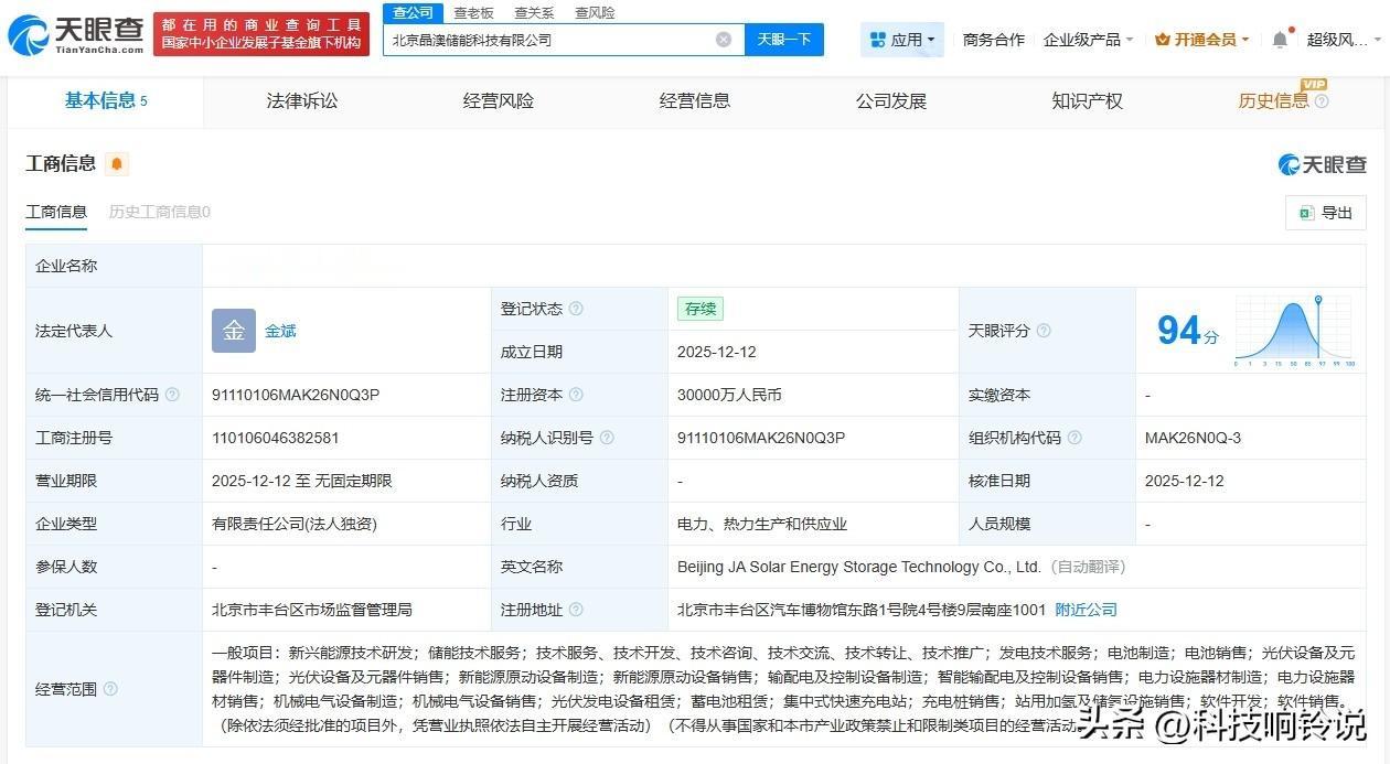 【晶澳科技在北京成立储能公司 注册资本3亿】 天眼查工商信息显示,近日,北京晶澳储能科技有限公司成立,法定代表人为金斌,注册资本3亿人民币,经营范围包括新兴能源技术研发、储能技术服务、新能源原动设备制造、新能源原动设备销售等。股东信息显示,该公司由晶澳科技(002459)旗下晶澳太阳能有限公司全资持股。 天眼查信息:
