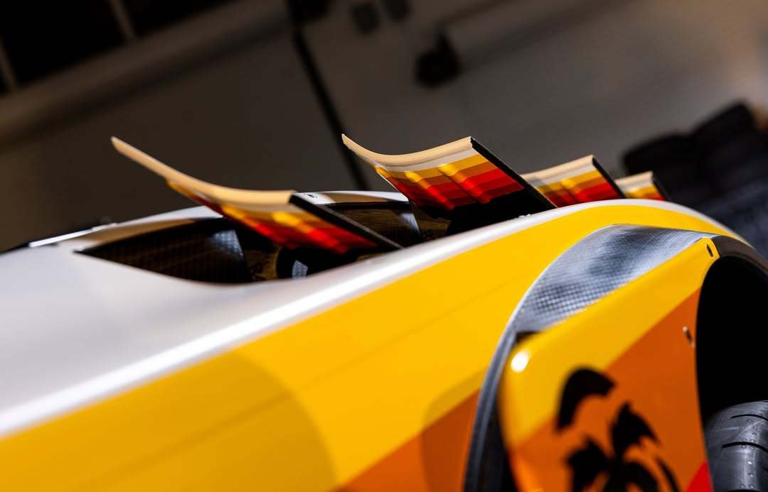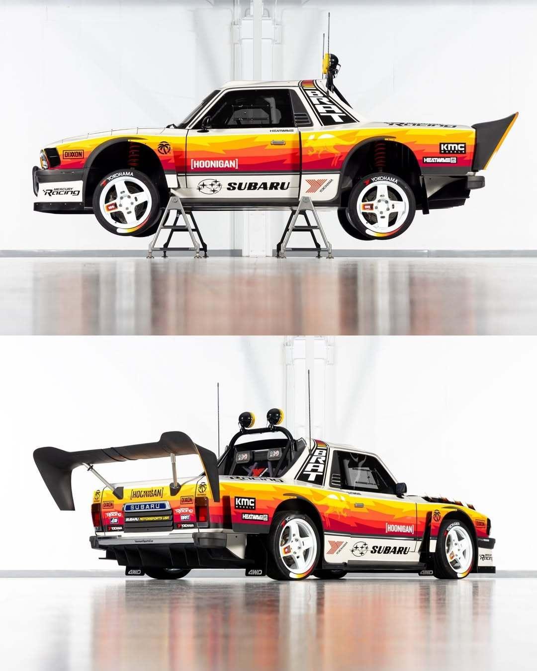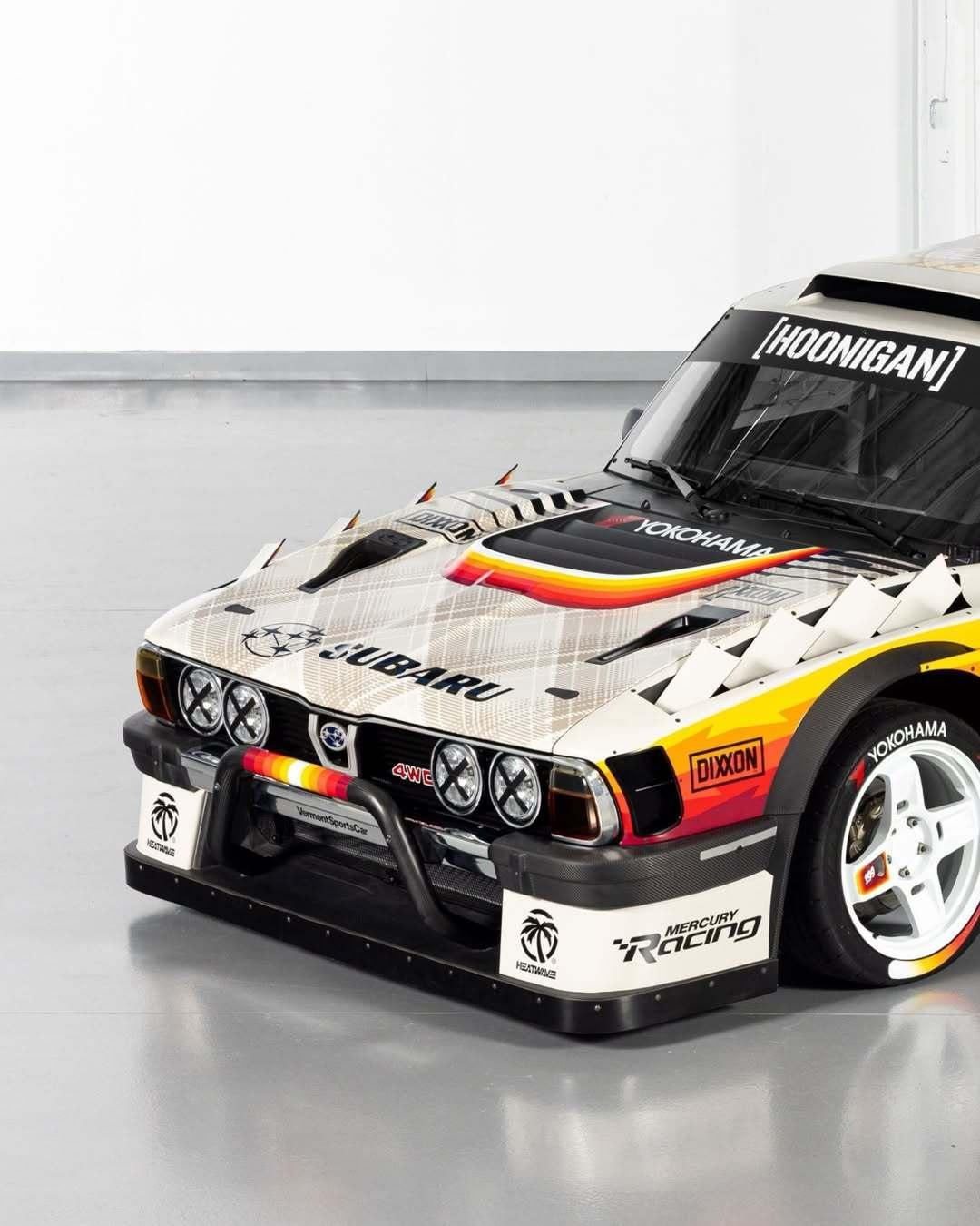 一天一张文艺照 斯巴鲁Brataroo 9500 Turbo的空力特色📢尾翼有两个版本,都可主动升降,较小尺寸的尾翼用于平时的驾驶,也是《Aussie Shred》视频中使用的尾翼(图4-6);大尺寸的尾翼用于更高下压力的场景,大尺寸的尾翼升起时宽度还会增加(图1-3)📢为了微调车头俯仰,前轮翼子板上采用主动可调角度的百叶板📢为了确保能完成视频中的铁轨跳跃、疾驰通过水面和后轮悬空漂移的动作,VSC采用了很平整、强度高的底盘护板