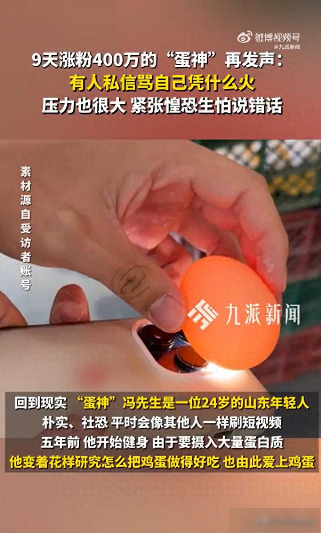 他说:“其实我很喜欢看短视频,平时生活的大部分时间也都在刷短视频,现在我的身份突然从一个刷视频的网友变成被很多网友关注的博主,私信多得翻不完,让我有种反差感,身份虽然转变了,但没有给我准备的时间,还没适应过来。”冯先生表示,自己的压力也很大,“因为被很多网友关注,生怕自己说错话、做错事。现在已经有人私信骂我了,说‘你就是个臭煮鸡蛋的,你凭什么火’,实际上我也不知道我凭什么火,我自己也一直想,但现在我只能装作没看到。”他说,一个人在年轻的时候就获得很多东西或者达成了某种成就,可能会情不自禁地飘飘然,“但我觉得这样是不好的,当然我也没有达到年少得志的状态,还是一个很普通的人,我自己也不想太过高调,我只想低调地继续煮我的鸡蛋,也一直告诉自己一定要稳住、稳住、再稳住。”