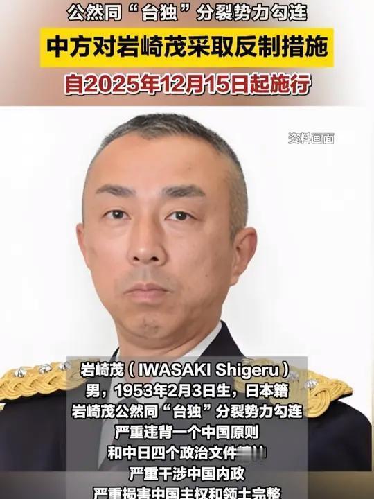 中方首次制裁日本自卫队前幕僚长,背后信号不容忽视 12月15日,外交部重磅发布第18号令:对日本自卫队前统合幕僚长岩崎茂实施全面反制,这也是近年来中方针对日本高层个人作出的最直接制裁。根据最新通告,岩崎茂因“公然勾连 “台独”势力、干涉中国内政”,其名下在华所有资产将被冻结,永久禁止入境,包括港澳地区,国内组织和个人也不得与其进行任何形式的合作或交易。这一系列措施即刻生效。 值得注意的是,作为日本防务系统资深人物,岩崎茂多次就 台湾 问题发声,并公开参与相关活动,对华关系敏感时刻选择“站边”,成为中方强硬回击的对象。此次反制,不仅彰显我国捍卫国家利益的坚定态度,还向外界强调“一个中国原则”不可触碰。 这则快讯已经引发舆论高度关注。实际上,中方已多次警告外部势力勿插手 台湾事务,高度警惕政治炒作。如今制裁“点名到人”,无疑是对所有试图挑战底线者的明确警告:干涉中国核心关切,将面临实质性代价。后续影响值得持续观察,大家怎么看?欢迎留言讨论!